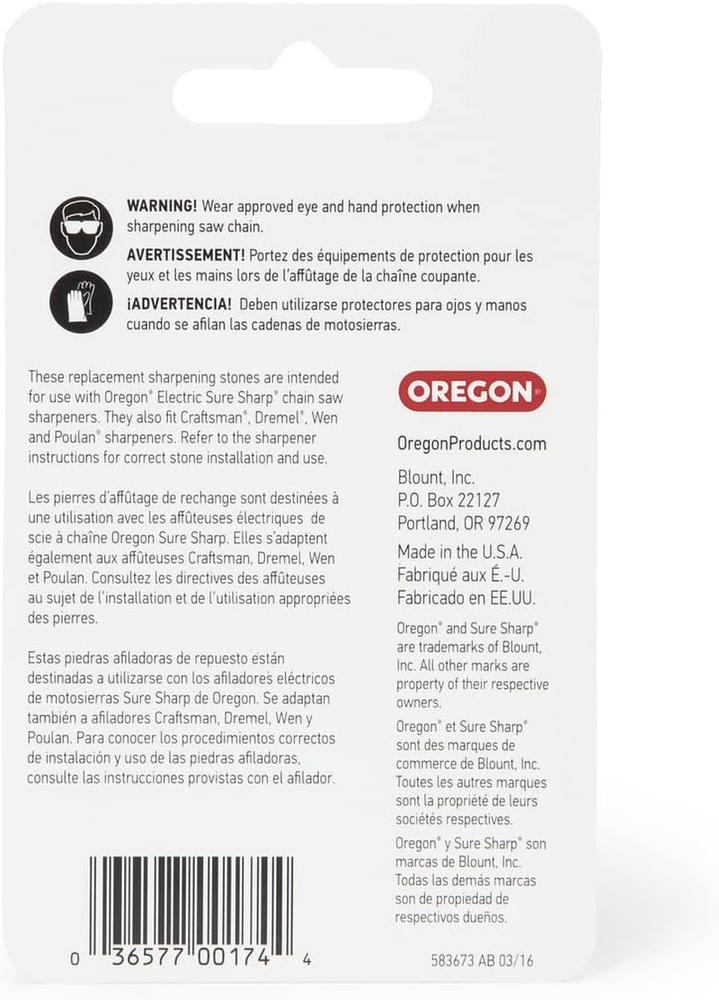 Oregon 28842 3/16-Inch Electric Sure Sharp Replacement Sharpening Stones Item model number 28842 Item Weight 0.04 Pounds Style Sharpening Stones Number of Items 3 Color Gray Brand Oregon Material Plastic Global Trade Identification Number 00036577001744 Grit Type Fine Department Unisex-Adult Is Discontinued By Manufacturer No Product Dimensions 4.7"L x 2.9"W x 0.3"H Manufacturer Oregon Tool Includes three 3/16" (4.8 mm) replacement shapening stones These stones leave an excellent cutting edge on saw chain and are easily replaced on most electric chain sharpeners Used with Oregon electric sure sharp handheld grinder to easily sharpen your saw chain Works with most electric saw chain sharpeners Easy to install on the sharpener Used with Oregon electric sure sharp handheld Grinder to easily sharpen your saw chain. These stones leave an excellent cutting edge on saw chain and are easily replaced on most electric chain sharpeners. Made in United States About Better Solutions Depot Better Solutions Depot offers the best prices we can on high quality products. Please remember we cover shipping costs so you don't have to! We am selling a large selection of adhesives, tools, auto parts, paints, and ot her handy items to make your life easier! Please let us know if you are unhappy with any purchase and we are happy to work with you to make sure we get it worked out quickly! Please also let us know if there are any products that you would like us to stock or re-stock and we will see if we can source them for you! Shipping Better Solutions Depot always works our hardest to ensure your package arrives as soon as possible. We will ship your package out within 48 hours at the latest after you place your order but we usually ship much quicker. Please understand that some factors like weather, high postal traffic, and the performance of shipping companies are outside of our control. We offer free shipping to 48 states. we do not accept P.O. Boxes though so please provide a physical address. Returns Better Solutions Depot offers a 30-Day Return Policy on items in which you are not completely satisfied with. You have the option of a full-refund or an exchange of the item. PAYMENT CONTACT US This page content is yet to come Please ad us to your favorite seller and visit again later Thank You