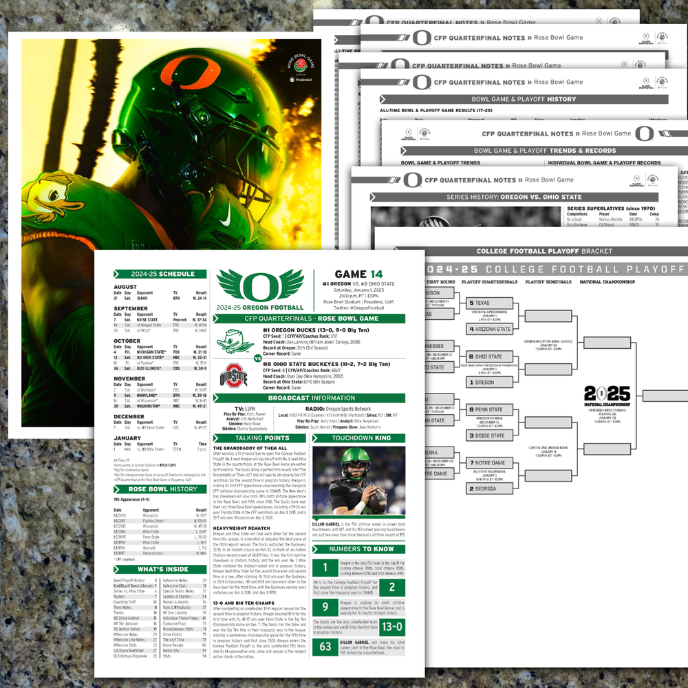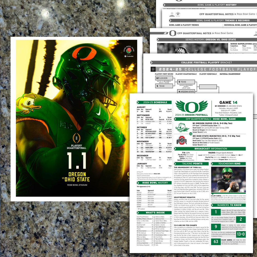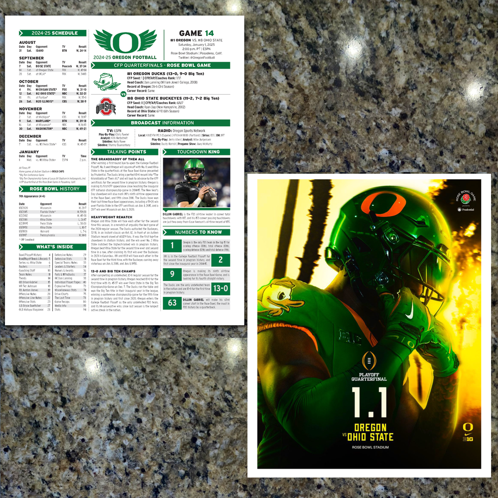 For sale, the official 29-pages Oregon Football Issued Media Program Game Notes from the 2025 Round Two College Football Playoff Rose Bowl Game! Wednesday, January 1, 2025. This is only given out to media and broadcast. History! I have 3 available ahead of the game. GAME: CFP - Round Two - Rose Bowl DATE: January 1, 2025 TEAM: Oregon PAGES: 29-pages STADIUM: Rose Bowl LOCATION: Pasadena, CA What you get: 1. 29 pages - Official Oregon Football Media Program Game Notes - 8.5x11" 2. Plastic protector sheet