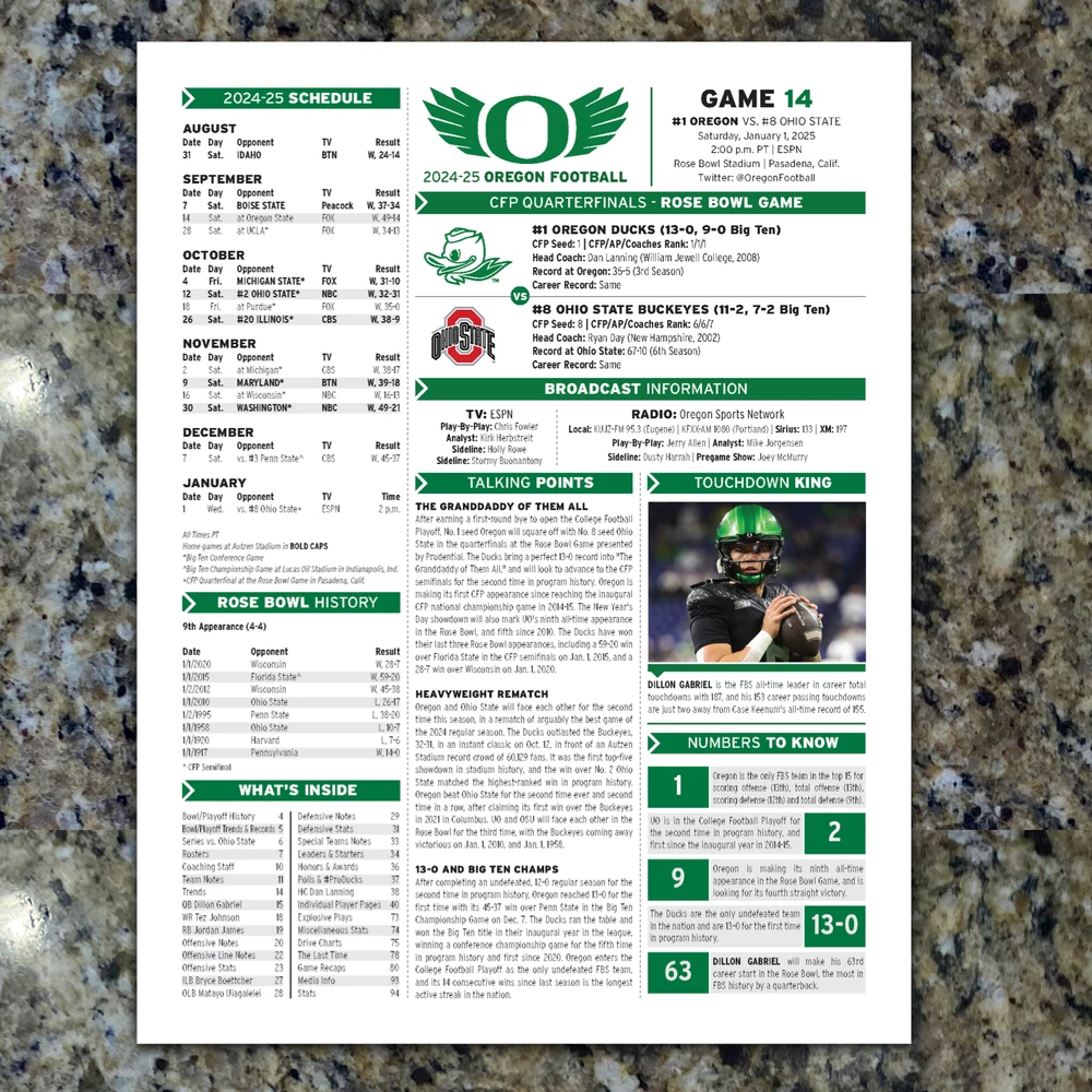 This is an awesome piece of Oregon football history! The official media game notes from the 2025 Rose Bowl CFP matchup are a must-have for any Ducks fan or collector. These 29-page programs were only given to press and broadcast teams, making them rare and unique. The detailed stats, player bios, and game insights make it feel like you're right there in Pasadena on game day. Perfect for framing or displaying, it’s a great way to remember a huge moment in Oregon football. Grab one before they’re gone!