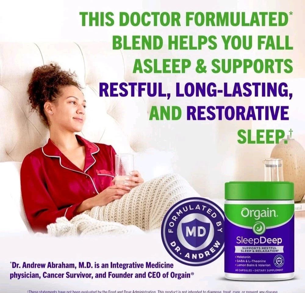 Orgain SleepDeep, Melatonin Sleep Aid Support Supplement with Magnesium, GABA, L-Theanine, L-Tryptophan, Chamomile, Lemon Balm & Valerian Root, Gluten Free, Doctor Formulated - 60 Count, 30 Day Supply About this item SUPPORTS RESTFUL SLEEP & RELAXATION^: Includes 3mg of melatonin, GABA, valerian root, L-theanine, L-Tryptophan & nighttime herbs like lemon balm, chamomile, passionflower, and magnesium. COUNT SHEEP, NOT THE HOURS: Snooze buttons, beware. Orgain’s SleepDeep includes Melatonin – a hormone created in our pineal gland that helps you fall asleep and supports restful, long-lasting, and restorative sleep^ QUALITY ASSURED: Drug Free and Non-Habit forming, Gluten free, No soy ingredients, doctor formulated*, No Artificial Flavors or Colors, Comprehensively tested for Quality, Made in NSF GMP registered facility DR. FORMULATED*: Thoughtfully formulated easy to swallow capsules by Orgain’s own Dr. Andrew Abraham* – an Integrative Medicine physician to support restful sleep & relaxation. SUGGESTED USE: For best results take 2 capsules with water or juice, 30 minutes prior to bedtime. Try with Orgain Stressless Supplement for additional benefits. WHAT TO EXPECT: Includes 1 (one) 60 capsule supply of Orgain SleepDeep supplements, equivalent to a 30-day supply