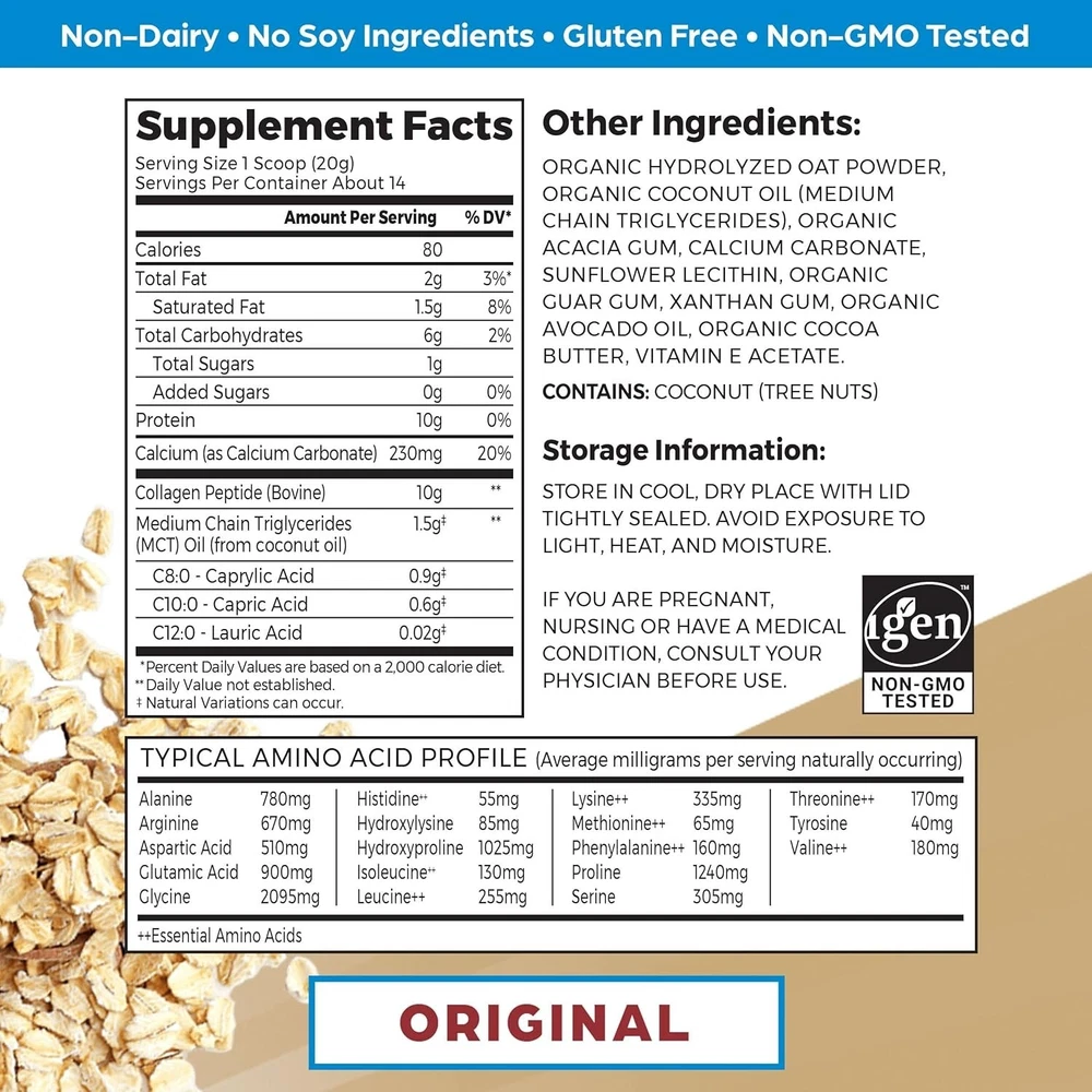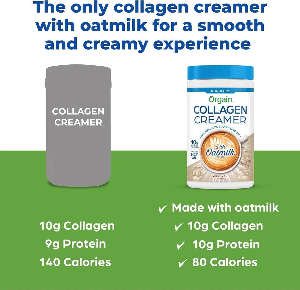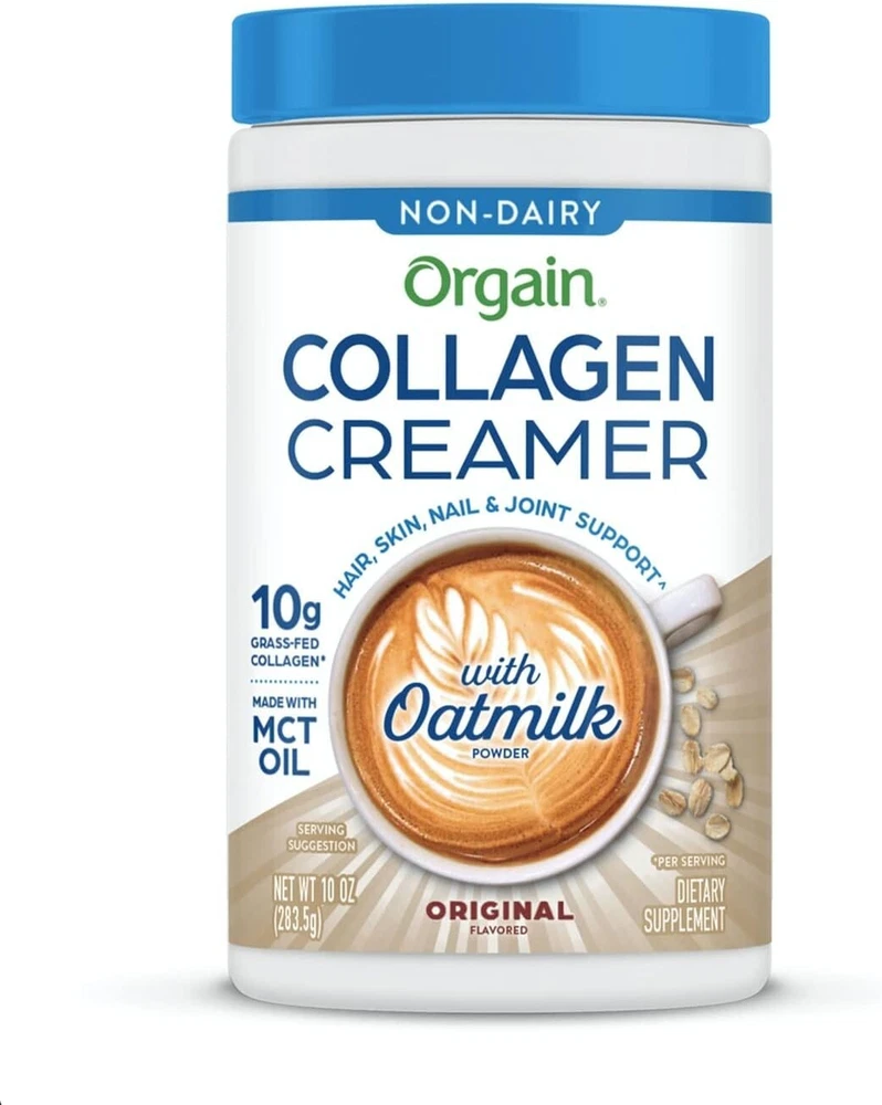 Orgain Collagen Coffee Creamer, 10g Grass Fed Hydrolyzed Collagen Peptides, Original - With Organic Oat Milk Powder, Coconut Oil, MCT Oil, Avocado Oil, Hair, Skin, Nail, & Joint Support - 10oz Includes 1 (10 oz) Orgain Original Collagen Creamer with Organic Oatmilk. Great for Coffee, Tea, Smoothies, or Baking. 10 grams of non-dairy collagen creamer made with organic oatmilk powder, organic coconut oil, and organic avocado oil, 1 gram of sugar, 80 calories per serving Made without soy, dairy, or gluten, Non-GMO, certified kosher, doctor developed Scoop, stir (or froth), and sip. Mix smooth, creamy collagen creamer into a morning cup of coffee or snack to elevate your daily glow Perfect for both men and women. Supports joint function and health, strong hair and nails, muscle recovery, and radiant skin. Boosts metabolism, improves digestion, and mixes easily in any food or drink.