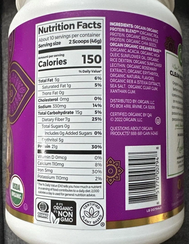 Orgain Organic Protein Powder- Chai Latte 16.3oz. 21g plant protein. 7g prebiotic and fiber. Limited edition flavor. Clean ingredients Best by date in photos