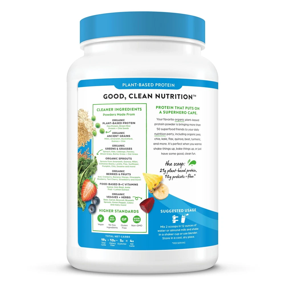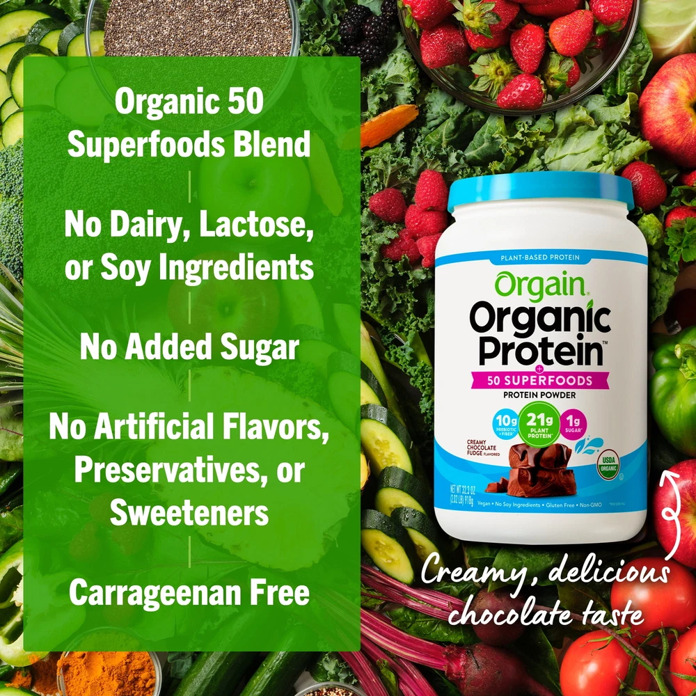 Product details What makes Orgain the #1 plant protein powder brand in the U.S.^? Is it the smooth and creamy flavor? The delicious taste without the grit? The fact that it serves up 21 grams* of organic, vegan protein optimized with 50 organic superfoods and an extra boost for maximum nutrition? Or that it's so easy to prepare? Truthfully, it's all of this and so much more. Our protein blend consists of organic peas, brown rice, and chia seeds, to provide a complete protein with all nine essential amino acids. Each serving contains 50 organic superfoods like kale, flax, broccoli, spinach, quinoa, beet, acai, and turmeric and is an excellent source of vitamin B6, vitamin C and iron to support your immune system. Not only does our plant-based protein powder serve up the tastiest, creamiest protein, but it's also made with uber clean ingredients and higher standards in mind! Enjoy a protein powder that's certified USDA organic, non-GMO, and made without soy, dairy, gluten, or artificial preservatives, sweeteners or flavors. On top of all of that, it boasts 10g* of prebiotic + fiber, 1g of sugar*, and has 160 calories*. Plus, when it comes to flavor and versatility, this powder delivers. Mix our plant-based protein powders with your favorite smoothies, almond or oat milk, and even baking mixes for to add a good, clean boost. At Orgain we celebrate taste, and we take it seriously because we recognize that part of living a vibrant life is loving what you eat. Go ahead, fuel up with the powder that's a treat for both your taste buds and your body so you can have energy to keep on going! ^Source: IRI, Total US MULO, Latest 52 weeks ending 10.08.23 *per serving, varies by flavor CLEANER INGREDIENTS: 21g plant protein and 1g sugar per serving. Our protein blend consists of organic peas, brown rice, and chia seeds, to provide a complete protein with all nine essential amino acids. It also features 10g of prebiotic + fiber* for gut support. HIGHER STANDARDS: We believe it’s what’s on the inside that matters most, and that includes what we left out. You also won’t find any GMOs, carrageenan, soy, gluten, or artificial colors, flavors, sweeteners, or preservative Organic 50 Superfoods Blend™: Each serving contains 50 organic superfoods like kale, flax, broccoli, spinach, quinoa, beet, acai, and turmeric and is an excellent source of vitamin B6, vitamin C and iron to support your immune system. USDA ORGANIC & CERTIFIED PLANT-BASED: To ensure we are delivering on high-quality products, we use third parties to verify that we are certified organic and certified plant based. PERFECT FOR ANY LIFESTYLE: This protein powder is perfect for men and women alike, whether you’re maintaining a healthy lifestyle, working out, looking to add more protein to your diet, or following a diet regimen. #1 PLANT PROTEIN POWDER BRAND: We are proud to be the #1 plant protein powder brand in the U.S.^.