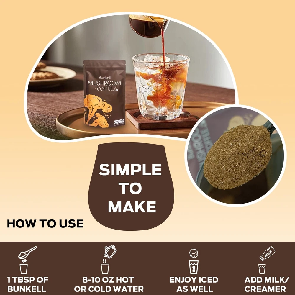 Six Mushrooms Coffee Blend: Mushroom coffee is maded by combining instant coffee with dried and finely ground mushrooms, features 6 premium mushrooms, includes Lion's Mane, Reishi, Cordyceps, Shiitake, King Trumpet & Turkey Tail, also plus MCT oil, coconut milk and organic Arabica coffee beans, better for focus & energy, digestion health and immune support. Enhance Immunity: Mushrooms and coffee beans contain compounds called polyphenols, because of their antioxidant properties, mushroom coffee can help strengthen one's immune health, block the damage caused by free radicals to us. More Healthier Coffee Alternative Drink: Mushroom Coffee! Known to have less caffeine than regular coffee, the amount of caffeine in Bunkell mushroom coffee is 48mg. Especially those sensitive to caffeine, it may improved your sleep quality friendly. Maintains gut health: Mushrooms are a good source of both fiber and prebiotics, the food for probiotics, both of which can help maintain gut health. Such as turkey tail, it has prebiotic properties that can promote intestinal health, improve digestive system function, gradually improve the gut microbiota environment and maintain a healthy state. Easy to Brew: The form of Bunkell mushroom coffee is instant mushroom coffee powder, just take 1 tsp(6g) coffee per 8-10 fl. oz, add creamer or milk according to your preference; If you like ice or hot coffee, also add ice cubes or brew it with hot water. The natural mushroom ingredients are very suitable for vegetarians.