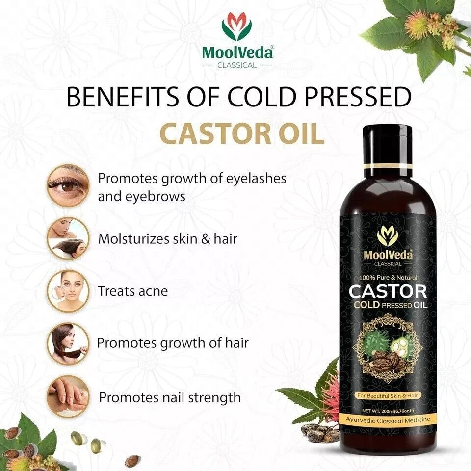 Premium Organic Castor Oil 100% Pure and Hexane-Free Cold-Pressed Beauty 6.7 fl oz (Pack of 1) Moolveda Pure Cold Pressed Castor Hair Oil For Hair Growth, Stronger Hair, Skin Care, Nails, 100% Pure & Natural, Moisturising Dry Skin, Nails, Eyelash, 200ml HAIR STRENGTHENING: Our castor oil strengthens hair roots, reducing breakage and improving overall hair strength and resilience. EYELASHES & EYEBROWS ENHANCEMENT: Moolveda Castor Oil is a natural and safe option for enhancing the thickness and appearance of eyelashes and eyebrows, providing beautifully framed eyes. SKIN NOURISHMENT AND HYDRATION: Rich in Vitamin E, our castor oil deeply moisturizes and nourishes the skin, leaving it soft, supple, and glowing. SAFETY OF USE: Moolveda Cold Pressed Castor Oil is a natural and chemical-free product, making it safe for all skin and hair types. However, perform a patch test before use, and avoid contact with eyes. If irritation occurs, discontinue use. CHEMICAL FREE BEAUTY: Moolveda Castor Oil is cold-pressed and chemical-free, making it a safe and multipurpose beauty elixir for skin and hair care. Note: This Product is designed to deliver optimal results, offering high-quality performance and satisfaction. Please note that individual experiences and outcomes may vary based on personal use, preferences, and unique circumstances. For best results, we recommend following the provided guidelines and ensuring the product is used as intended. Product result may vary for every individual.