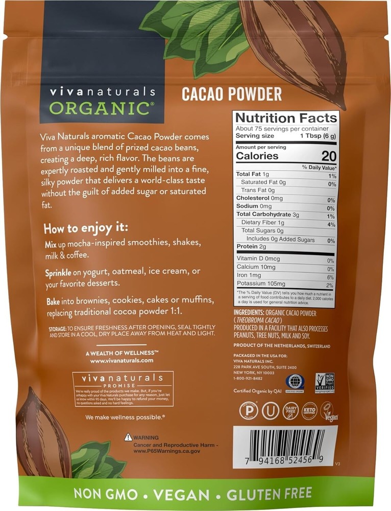 ORGANIC CACAO POWDER - Experience decadent, rich, dark chocolatey goodness with our pure, organic cacao powder. The aroma of rich dark chocolate not only tantalizes your senses but also delivers a guilt-free indulgence, crafted with no added sugar. BLENDS EASILY IN SMOOTHIES & HOT CHOCOLATE - Gently milled into a fine, silky powder without clumps or grittiness, our unsweetened cacao powder is an easy and delicious addition to your morning smoothie, shake, yogurt, oatmeal - you name it. THE IDEAL BAKING SUBSTITUTE - If you’re looking for an organic alternative to dark chocolate or cocoa powder, swap our cacao powder organic 1:1 for traditional organic cocoa powder in all your favorite cakes and cookie recipes. KETO, PALEO, VEGAN & GLUTEN FREE - Not only is our pure cocoa powder unsweetened, it is non-alkalized, gluten-free, Keto and Paleo, dairy-free, and kosher - a must-have kitchen staple. QUALITY YOU CAN TRUST - Forget fillers and additives. Viva Naturals cacao powder is USDA-certified organic, Non-GMO Project Verified, and contains just one ingredient: organic dark cacao powder ground from the cacao beans of the Theobroma cacao tree.