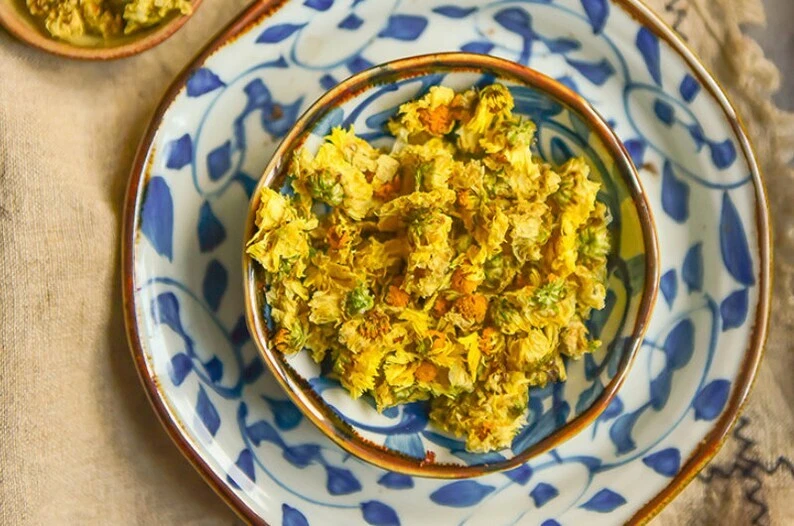 Origin: China Package include: 100g / 250g / 500g The chrysanthemum buds also called as tai ju, come from young Hangzhou white chrysanthemum flowers, one of China’s four famous chrysanthemum types. These chrysanthemum buds herbal tea are selected from the first batch of the flower buds at the early of November in Tongxiang, Zhejiang Province. It is a first grade. Chrysanthemum buds tea have no caffeine and can be consumed any time of day without disrupting your sleep. The flower tea buds are stonger and richer in flavor than the fully-bloomed flowers themselves. Brewing Instruction: Porcelain gaiwan or glass tea cup is suggested for brewing the chrysanthemum buds herbal tea, 3-5g tea with wate about 200-300ml and the water temperature should be around 100℃, do not be too low. Stay for about 1-2 minutes, you can begin to drink the tea. Storage: Stored in a dry place and no direct sunshine.