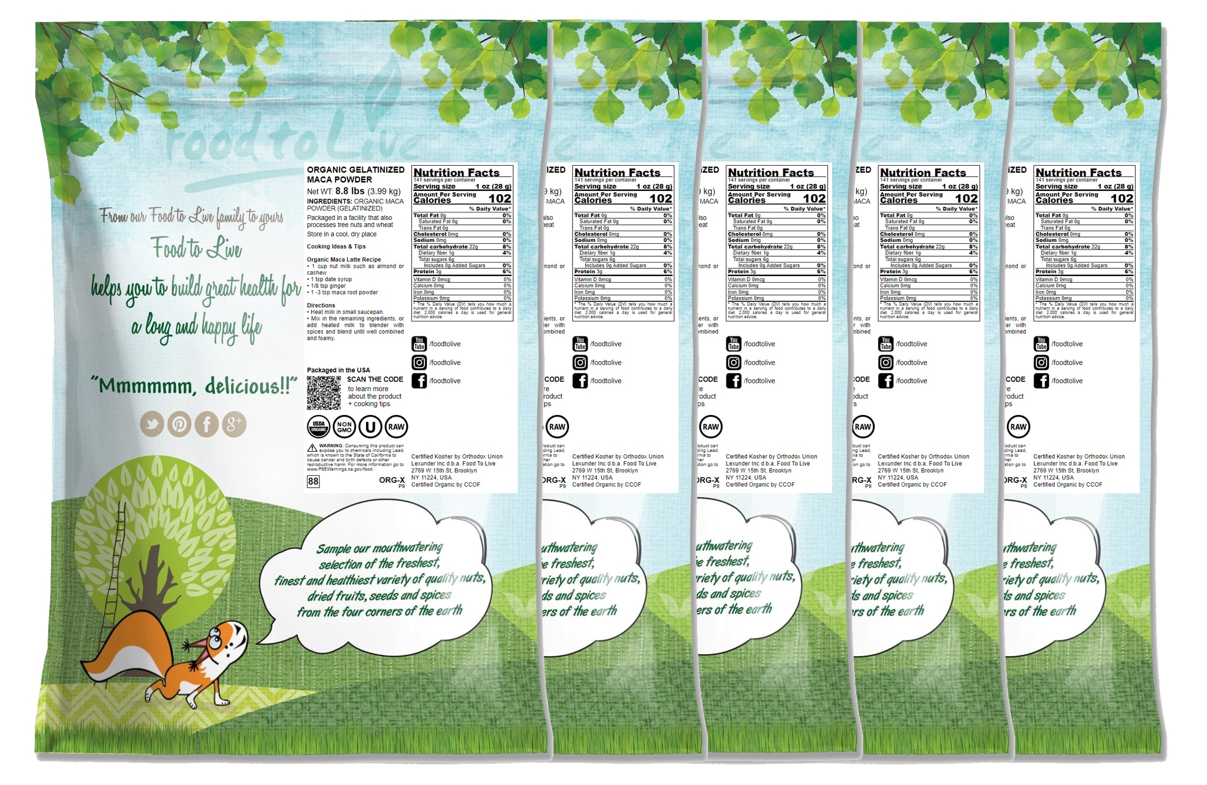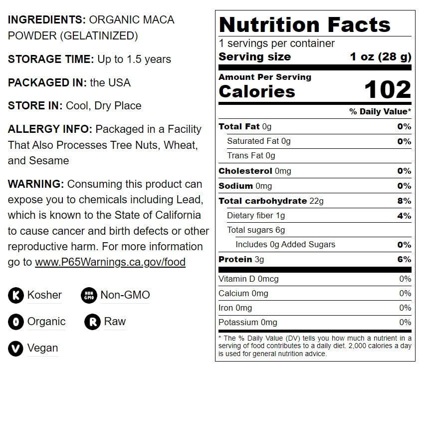 Organic Maca Powder ( Gelatinized) Certified Organic by A Bee Organic Certified Kosher by Union of Orthodox Jewish Congregations of America Suitable for Vegetarians Suitable for Vegans Non-GMO About the product: ✔️ ORGANIC & NON-GMO: Food to Live Yellow Maca Powder is Organic and Non-GMO. It is Kosher and contains no added sugars. ✔️ GELATINIZED & VEGAN: Organic Yellow Powdered Maca by Food to Live is Gelatinized, meaning it is not raw, and was gently heated which makes it easier to digest. Gelatinization does not affect Maca's nutritional profile. This product is Vegan. ✔️ NUTRITIOUS SUPERFOOD: Organic Yellow Raw Maca Powder is loaded with Vitamin C, Potassium, Calcium, and Iron. Moreover, it contains flavonoids, which are rich in antioxidant activity. ✔️ VERSATILE & DELICIOUS: Yellow Maca Root Powder is the best tasting variety of Maca. Its mild flavor combines well with sweet fruits and veggies. Add it to smoothies, shakes, juices, lattes, homemade ice-cream, baked goodies, raw energy balls, dressings, and sauces. ✔️ LITTLE POWDER - LOTS OF POWER: Half of teaspoon of Yellow Maca Powder a day, is enough to reap its advantages. Product Description: Maca powder is exceptionally good for you because it’s nutritious and has a strong positive effect on the hormone levels. Its nutritional value is so high, it’s considered superfood. You should eat only 2-3 tablespoons of Organic Maca Powder from Food To Live a day to get a boost of essential minerals and vitamins, as well as easily digestible plant-proteins. Originating from Peru, maca plant (Lepidium meyenii) has been used as a fertility booster and aphrodisiac for many centuries. The benefits of maca powder for women and men include the normalization of natural hormone levels as well as enhanced sexual function. It’s also known as Peruvian ginseng and can alleviate the symptoms of menopause in women. This product is processed in a facility that also processes tree nuts and wheat. WARNING: Consuming this product can expose you to chemicals including lead, which is known to the State of California to cause cancer and birth defects or other reproductive harm. For more information go to www.P65Warnings.ca.gov/food.