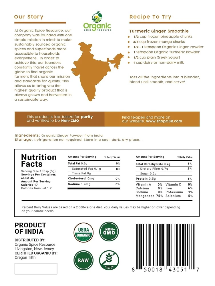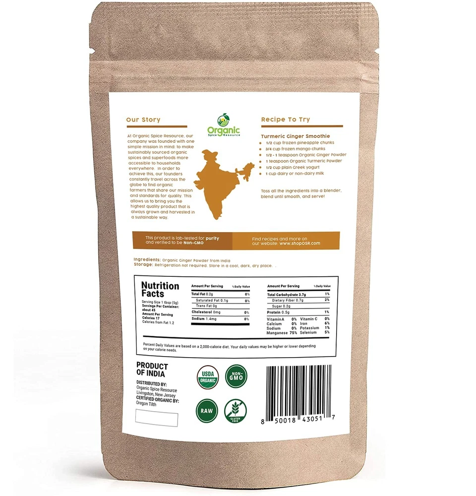 FEATURES - 8oz / 226g, NON GMO verified project, Gluten Free, USDA Organic, Raw From India. HEALTHY & DELICIOUS - A staple in kitchens around the world for centuries, ginger lends a pungent, sweet and spicey flavor to everything from soups and sauces to cookies an cakes. USAGE - Ginger can be used fresh, dried, powdered, or as an oil or juice, and is sometimes added to processed foods and cosmetics. It is a very common ingredient in recipes.