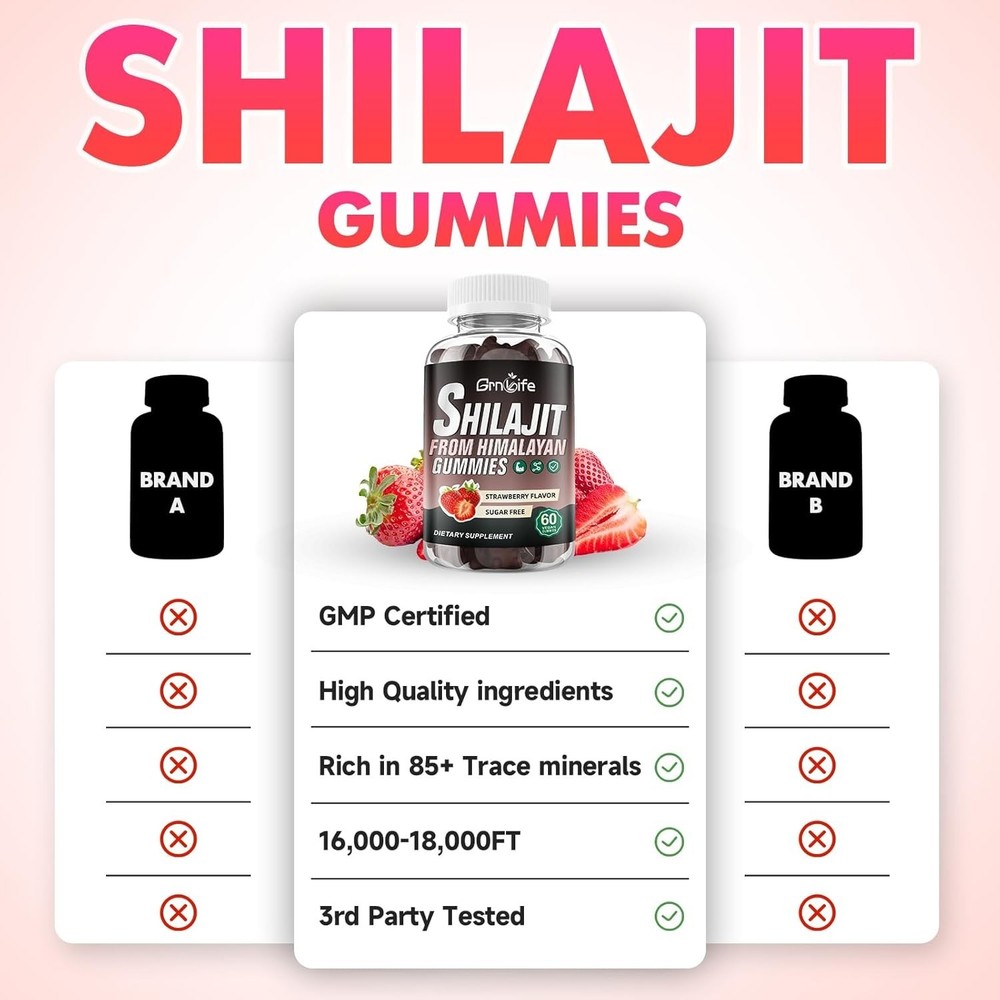 Shilajit Gummies for Men & Women, 1000MG Shilajit Supplement with 85+ Trace Minerals & Fulvic Acid for Energy, Immunity, Sugar-Free, Strawberry-60 Count PURE SHILAJIT GUMMIES: Our organic shilajit gummies for men & women, sourced from the untouched heights of 16,000-18,000 feet in the Himalayan mountains. Experience the potency and purity of this organic treasure, straight from the Himalayas, and balance the vitamins and minerals in your body. PURE SHILAJIT BENEFITS: This pure shilajit supplement contains a powerful blend of ingredients that help in boosting energy, cognitive health, boost metabolism, supercharge you with energy, stabilize your mood, and aid a healthy skin and hair. With our shilajit gummies, you'll not only boost your productivity, but you'll be able to enjoy a better life. 85+ TRACE MINERALS: Our Himalayan shilajit for men and women provides a rich source of over 85 trace minerals, including essential elements like selenium, copper, manganese, and more. These pure shilajit resin gummies are sugar-free and contain natural fulvic acid, providing excellent antioxidant support for your health. EASY TO CHEW & SUGAR-FREE: Our strawberry flavor pure shilajit gummies are sugar free (no cane sugar), Non GMO, vegan friendly. Includes organic ingredients, gluten free, allergen free and without unnecessary additives. EXCELLENT IN QUALITY: Grnlife shilajit gummies are GMP compliant and Lab-tested, all batches have quality assurance at every stage of production. We always strive to create the highest quality dietary supplements to be your partner in health.
