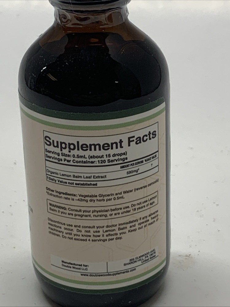 Department:Does not applyVolume:Does not applyBrand:Double Wood SupplementsUPC:NAAdministration:Does not applyIngredients:Does not applyProduct Dimensions:1.5 x 1.5 x 5 inches; 4.94 ouncesActive Ingredients:Lemon BalmType:Does not applygtin13:NAType of Diet:Does not applyBody Area:Does not applyExpiration Date:Does not applyMain Purpose:Does not applyMPN:Does not applyCountry/Region of Manufacture:Does not applyCalifornia Prop 65 Warning:Does not applyScent:Does not applyFeatures:Does not applyItem Weight:Does not applyNumber of Pills:Does not applyFormulation:Does not applyDosage:Does not applyWhen to Take:Does not apply
