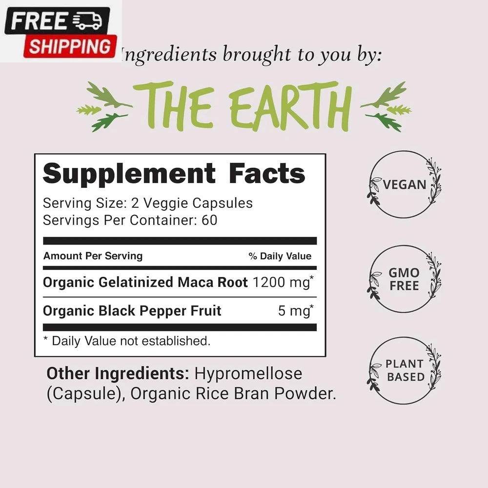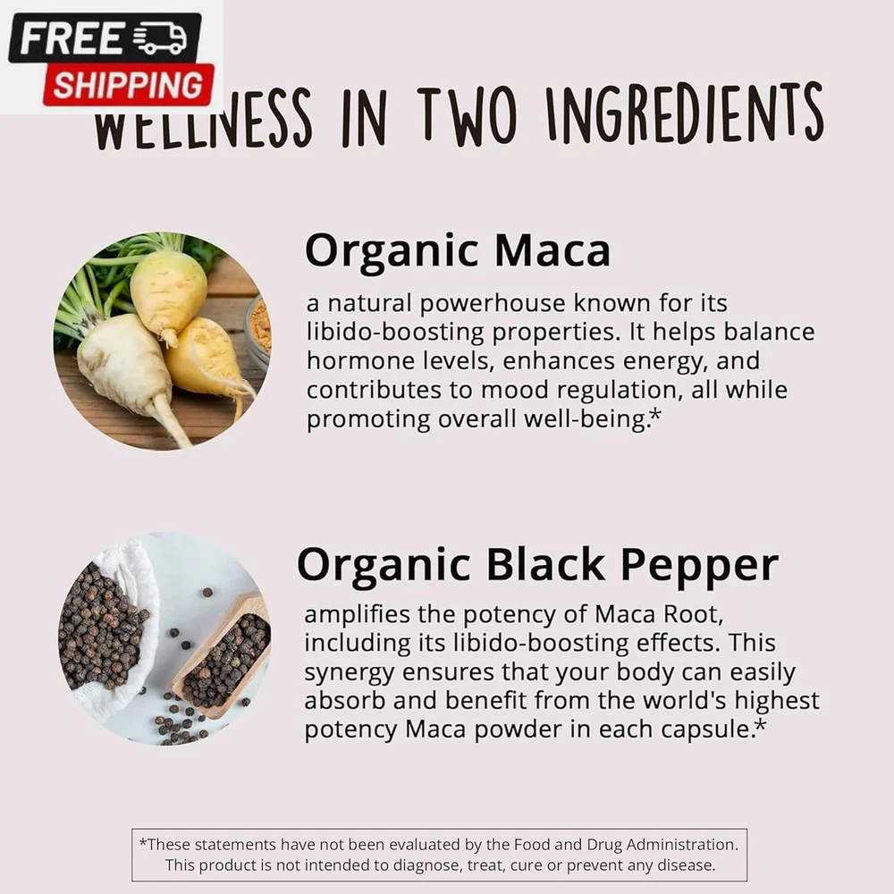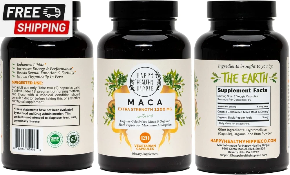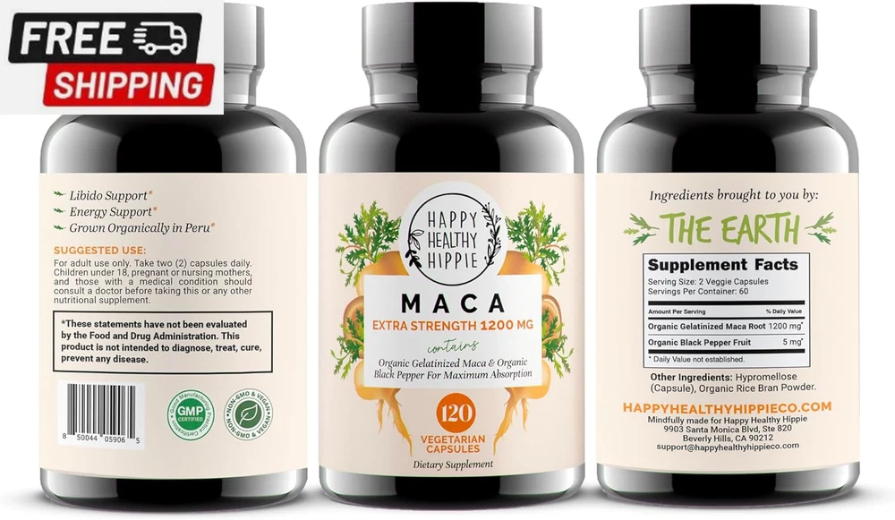 Fast Shipping On All Items 30 Days Money Guarantee Customer Support Excellent Service 100% Satisfaction Satisfaction Guaranteed Organic Maca Root Capsules - Libido Booster for Women - 1200 Mg Maca Root Powder | Energy Pills from Peru | Female Libido Booster for Performance | Aphrodisiac | Fast Absorption & Potent, 120 Ct Specification Item Package Quantity 1 Is Discontinued By Manufacturer No Package Information Bottle Item Form Capsule Package Dimensions 4.69 x 2.64 x 2.64 inches; 0.04 ounces 2.64 inches x 4.69 inches x 2.64 inches. Weight: 0.04 oz Item Description [Potent Maca Root Capsules] Help obtain natural vigor & energy. Optimized for fast uptake and absorption, scientific studies revere this natural aphrodisiac for promoting energy, vigor, focus, hormone balance plus a significant performance boost. [Libido Booster for Women & Men] Maca is often associated with boosting libido in both women and men. Traditionally used to support sexual well-being, energy, stamina and endurance. Effective arousal supplements for women and men. [Energy Pills] Maca can help increase energy and reduce fatigue, and help improve athletic performance. Not only that, but maca can help with mood regulation and aid in hormone balance. These maca root capsules are designed for women and men. [Ultra Potent & Effective] We pack each maca capsule with 1200mg of the highest potency maca powder in the world. Then add organic black pepper extract for increased absorption and bioavailability – the maca extract your body can easily absorb. [Supported by Science - Passion, Performance & Desire] Countless scientific studies support the fact that maca pills are a natural enhancer for women & men, prized for its ability to fire up passion, reinvigorate desire & promote strong performance. [Maca from Peru] Maca is a plant that is native to the high Andes mountains of Peru. It has been used for centuries by indigenous people in Peru as a source of food and medicine. The root of the maca plant is rich in nutrients & bioactive compounds. [Happy Healthy Hippie Commitment] Join the thousands of happy customers who have made the switch to our maca supplement. We're confident you'll love these capsules [Wellness from the Earth] Our products are simple, natural, and curated with intentionality. As a company, we are rooted in the ancient philosophy of herbal healing and we take pride in providing our customers with wellness from the Earth. Product Description 1 Ignite Your Desire 2 Supercharge Your Days 3 Lift Your Spirits 4 Advance Your Wellness 5 Enriched With Nutrients Happy Healthy Hippie Vegan & Plant-Based Supplements Add to Cart Add to Cart Add to Cart Add to Cart Add to Cart Add to Cart Add to Cart Customer Reviews 4.1 out of 5 stars 1,804 4.2 out of 5 stars 8,004 4.4 out of 5 stars 63 4.5 out of 5 stars 165 4.2 out of 5 stars 13,589 4.2 out of 5 stars 8,004 4.4 out of 5 stars 1,407 Price $17.75 $ 17 . 75 $23.95 $ 23 . 95 $19.95 $ 19 . 95 $21.99 $ 21 . 99 $29.49 $ 29 . 49 $29.49 $ 29 . 49 $21.49 $ 21 . 49 Best For Libido & Energy Menopause Support Blood Pressure Support Energy, Immunity & Thyroid Mood, Stress & Tension Hormone Balance Skin, Hair & Nails Key Herbal Ingredients Maca DIM, Dong Quai, Probiotics Organic Beetroot Powder Sea Moss, Bladder Wrack St. John's Wort, Ashwagandha Chasteberry, Maca, Dong Quai Plant-Based Extracts Made in the USA Yes Yes Yes Yes Yes Yes Yes Non-GMO ✔ ✔ ✔ ✔ ✔ ✔ ✔ Item Form Capsule Capsule Capsule Softgel Capsule Capsule Tablet About us We offer the best prices around on high quality products. Our E-store includes media such as books, movies, music and games while offering electronics, toys, sporting apparel, clothing, tools, general home, garden items and more. Shipping We are always working hard to ensure your package arrives as soon as possible. Please understand that some factors like weather, high postal traffic, and the performance of shipping companies are outside of our control. We offer free shipping to the lower 48 states and ship within 2-3 business days of payment, usually sooner. We do not accept P.O. Boxes. Please provide a physical address. For shipping outside of the continental USA, we only use eBay's Global Shipping Program.The item is shipped to KY and then sent to the rest of the world. International customers are responsible for all duties and taxes. Continue to check out to calculate costs for shipping the item to your country. Messages regarding eBay's Global Shipping Program MUST be directed at eBay EXCLUSIVELY. Returns We offer a 30-Day Return Policy on items in which you are not completely satisfied with. You have the option of a full-refund or an exchange of the item. No returns are available on items shipped outside of the USA Satisfaction We try over very best to make sure every customer is completely satisfied. If there's a problem, message us! We're happy to help. Payment Options Shop With Confidence