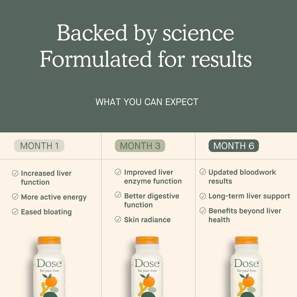 DOSE for Your Liver Cleanse Detox & Repair, Organic Milk Thistle16oz 3BottlePack Brand New Item. Free Fast Shipping . Products Description: for Your Liver Cleanse Detox & Repair, Organic Milk Thistle Supplement with Turmeric, Dandelion, Ginger, and Orange, Promotes Optimal Liver Function,16oz Bottle, 3 Pack (3 Weeks Supply) About this item: · PURIFY AND NOURISH: Each shot assists the liver in filtering out unwanted substances and includes bioflavonoids that support healthy liver enzyme function. · WHAT YOU RECEIVE: This set includes three (3) 16oz bottles, one (1) Dose engraved stainless steel 2oz shot glass, and one (1) Dose branded protective box specifically designed to protect your bottles from damage during shipping. Our product is shelf-stable until opened. Refrigerate after opening. · DAILY SHOT: Each 16oz bottle contains 8 servings, we recommend a 2oz shot 1-2 times daily. Also included is a Dose engraved stainless steel 2oz shot glass for convenient measurement each time. · STIMULATES LIVER AND AIDS DIGESTION: Increases liver function and activates the liver for improved performance. Stimulates the liver's production of bile, which breaks down fats and aids in the digestion of food, resulting in improved nutrient absorption and enhanced overall digestive efficiency. · UNIQUELY FORMULATED: Made with the world’s first organic bioavailable Curcumin (Turmeric extract). It is 24x better absorbed in the body than comparable shots. 1 Dose Shot = 50g of household Turmeric powder. Safety Information Keep out of reach of children. Ingredients Organic Turmeric Extract,Organic Dandelion Powder,Organic Milk Thistle Extract,Organic Ginger Powder,Purified Water,Organic Erythritol,Organic Orange Juice Concentrate,Citric Acid,Potassium Citrate,Sodium Citrate,Organic Flavors,Xanthan Gum,Organic Monk Fruit Extract. Directions Each 16 oz bottle contains 8 servings.We recommend a 2 oz shot 1-2 times daily. Return & Exchange: We Accept return as per eBay Return Policy, Customer satisfaction is our priority. If there is a problem with your order then please contacts us, we will provide you the best solution. Return shipping is the buyer's responsibility unless the return is a result of our mistake. We will pay for shipping replacement back to you if an exchange is requested. Note: Customer satisfaction is very important to us. If you have any problem with your order, please contact us and we will do our best to make you satisfied, please do not a negative feedback before we resolve your problem, we guarantee that your issue will be solved quickly. This item cannot be shipped to AK, HI, Puerto Rico, FAA Address, APO, FPO, PO Box and outside of USA.