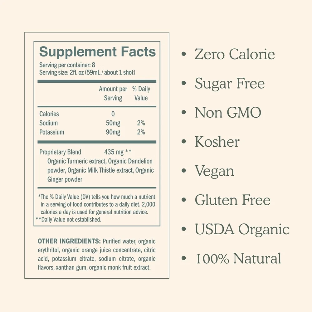 Main Purpose: Cleansing gtin13: 860009186040 Expiration Date: See description Volume: 16 fl oz MPN: Does not apply Flavor: Neutral Formulation: Liquid Dosage: Two Shots Active Ingredients: Turmeric Brand: DOSE Ingredients: Organic Turmeric Extract, Organic Dandelion Powder, Organic Milk Thistle Extract, Organic Ginger Powder, Turmeric Item Weight: 16 oz When to Take: After Meal Number of Pills: 3 UPC: 860009186040 Department: Adult, Unisex Country/Region of Manufacture: United States Features: Organic Type: Vitamin