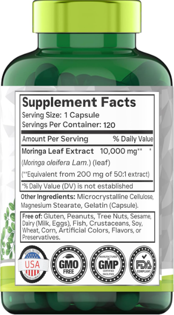 MORINGA Capsules Single Origin Moringa Powder Organic Moringa Leaf 120Capsules US Warehouse - FREE & FAST Shipping in US Product Description: These statements have not been evaluated by the FDA. This product is not intended to diagnose, treat, cure, or prevent any disease or health condition. Ultra Potent Moringa Capsules: 10,000mg Per Capsule! Four (4) Month Supply! Each Bottle Of Moringa Oleifera Leaf Powder Capsules Contains 120 Capsules, or a 4 Month Supply! Moringa Supplements Provide Powerful and Complete Supergreen and Superfood Nutritional Value! Moringa Powder Capsules May Help With Many Bodily Functions and Systems Due to Their Vitamin, and Mineral Content. Some Say That Moringa Powder Provides Energy,Boosts Metabolism, Immune Support, Digestion Support, as well as Joint, Bone, and Skin Support.* Moringa Capsules are Non-GMO! Our Moringa Powder Capsules are Both Manufactured and Third-Party Laboratory Tested in the USA! They are Free Of: Gluten, Peanuts, Tree Nuts, Sesame, Dairy (Milk and Eggs), Fish, Crustaceans, Soy, Wheat, Corn, Artificial Colors, Flavors, and Preservatives! Feedback: 1.Any question for your order, please contact us in time, we will reply to you within 24 hours and give you a satisfactory answer. 2.If you are satisfied with our products and services, hope to take up your a little precious time to leave feedback reviews for our products.Thanks! 3.Your satisfaction is our effort. Welcome to order again! Have a great day! Our Policy: 100% Satisfaction Guarantee 20% of restocking fee will be charged for return item
