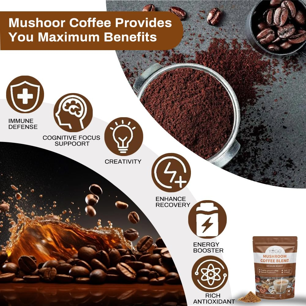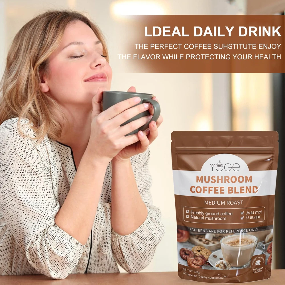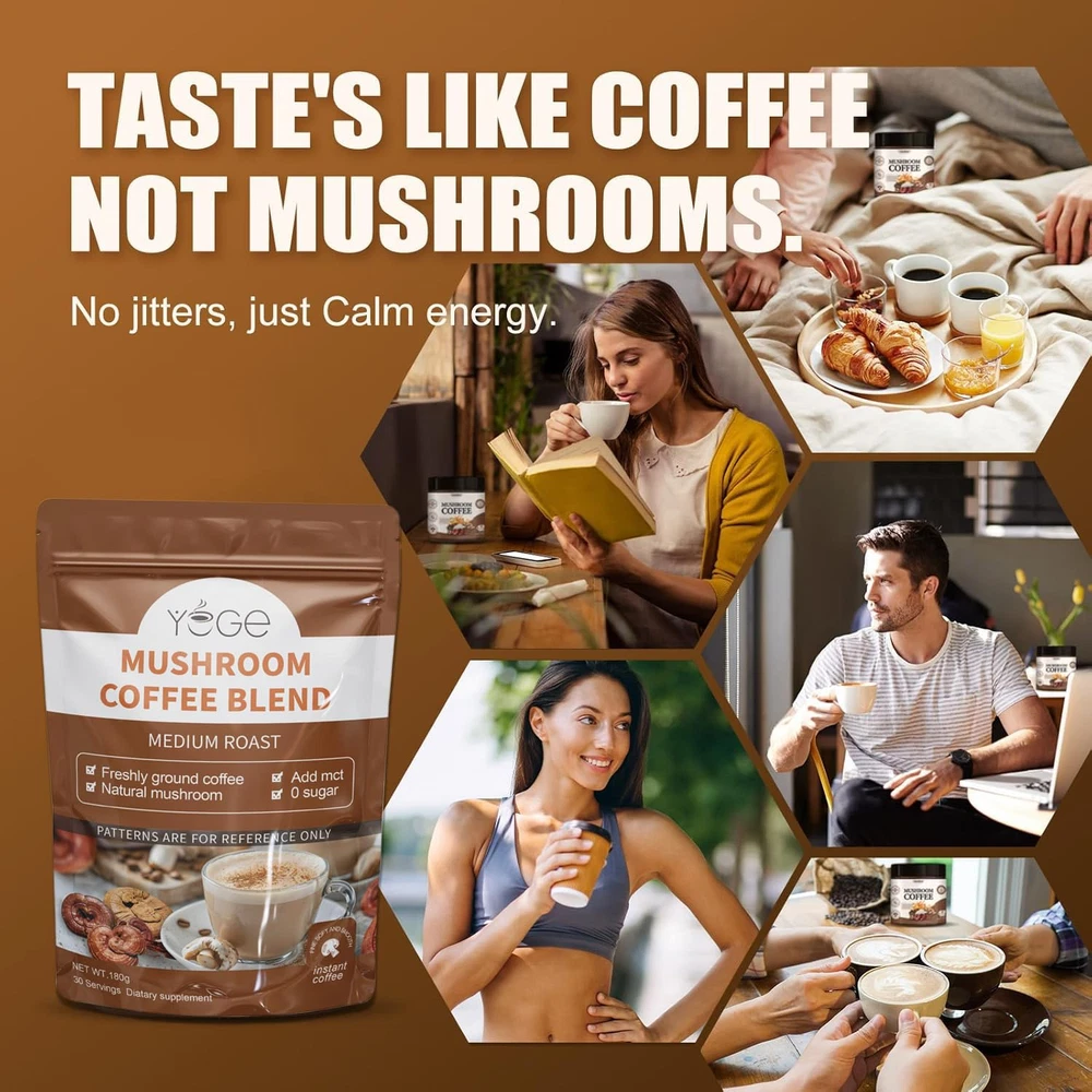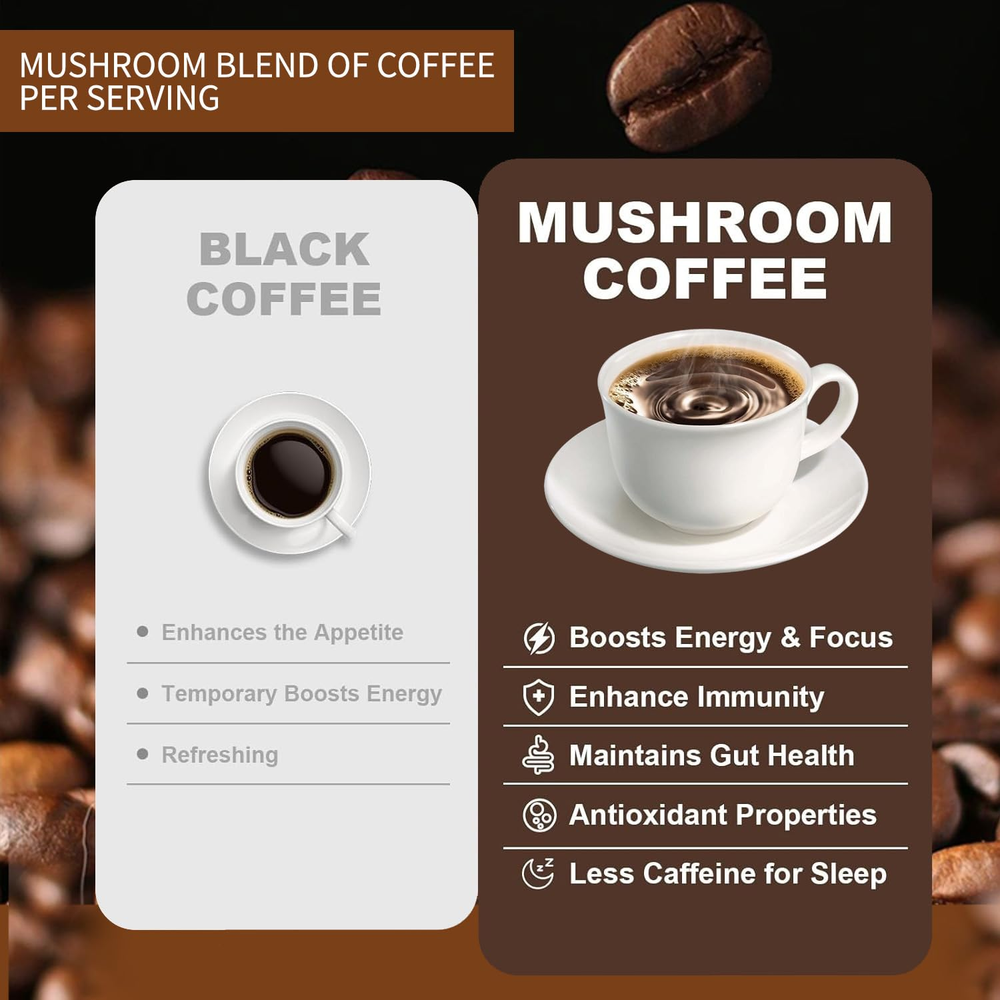 Mushrooms Coffee Blend: Our organic mushroom coffee blends 6 adaptogenic mushrooms(Lion's Mane, Cordyceps, Turkey Tail, Reishi, Shiitake and King Trumpet) mixed with organic instant coffee, contains organic MCT oil and organic coconut milk.. Each serving contains 2000mg of mushrooms, combining the benefits of multiple mushrooms for a comprehensive health experience. Better Energy and Focus: These adaptogenic mushrooms such as Lion's Mane, Reishi and Cordyceps, which help enhance the brain's cognitive function and focus, support the health of the intestinal and digestive systems, provide the body with lasting energy, help enhance immunity, promotes relaxation and calmness. Use mushroom coffee Blend to energize your daily life. Natural and Premium: Mushroom Coffee Powder is meticulously lab-tested to ensure your daily brew is gluten-free, vegan, alcohol-free, and non-GMO. Indulge in the nourishing benefits of functional mushrooms for a truly holistic health experience. Mushroom Coffee Benefits: Blend designed to fuel your day with the benefits mushrooms for optimal gut health, energy levels, and sustained mental clarity and focus. Discover vitality in your everyday dose of our instant mushroom coffee— promoting healthy living with every sip,It is perfect for those who need to improve concentration and maintain vitality. Multiple Brewing Methods: The mushroom coffee is instant mushroom coffee powder, just take 1 tbsp(about 6g) coffee per 6-10 fl. oz, add creamer or milk according to your preference; If you like ice or hot coffee, also add ice cubes or brew it with hot water. Product Description