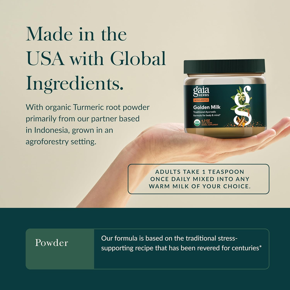 Store New Arrivals Add to Favorite View Feedback Contact Fast deliveries to the customer's home Quality customer service John Make the customers happy! Golden Milk Supplement Powder - Made with Organic Turmeric Curcumin, Black Pepper, Ashwagandha, Dates, Cardamom, and Vanilla for an Ayurvedic Cup of Natural Calm - 4.3 Oz (35-Day Supply) Description Premium Ingredients: Made with turmeric, black pepper, ashwagandha, dates, cardamom & vanilla Traditional Stress-Supporting Ayurvedic Recipe: This cup of calm helps support both the body & mind Convenient Golden Milk Powder: Delicious in both dairy and non-dairy milks or mixed into coffee Purity-Tested: Our Golden Milk powder is vegan, gluten- and soy-free & proudly made in NC, USA Our Story: Since 1987, our purpose has been to connect people, plants, and planet to create healing Gaia Herbs Golden Milk is based on the traditional Ayurvedic recipe that has been savored for centuries. This traditional drink has been used to support the mind, body, and spirit in a number of ways. Our Golden Milk supplement powder is vegan, gluten-free, dairy-free, and soy-free—with natural sweetness from dates. This caffeine-free drink mix provides the benefits of turmeric in a convenient beverage. We also include black pepper in our Golden Milk formula, which supports the bioavailability of turmeric’s beneficial curcuminoid compounds.* Sip your way to serenity by simply adding this convenient vegan powder into the warm beverage of your choice.* From seed to shelf, Gaia is deeply committed to the purity, integrity, and potency of each product. Since Gaia Herbs was just a seedling in 1987, we have focused on connecting people, plants, and the planet to create healing. We use only organic methods to cultivate more than 6.5 million plants each year. That same organic approach continues throughout our manufacturing. We use patented technology to achieve the highest efficacy of each herb. We are a company devoted to transparency. We have created Gaia’s MeetYourHerbs platform, one of the world’s first and only herb traceability programs, allowing consumers to learn about and engage with their organic herbs. We are able to source premium ingredients so you always know what's in your supplement. As a Certified B Corporation, we are actively working toward building a more inclusive and sustainable world. We nurture healthy connections between plants and people by encouraging strong relationships and championing environmental sustainability within the communities that we work with around the world. Item model number 90C60002 Item Package Quantity 1 Product Dimensions 3.35 x 3.35 x 3.25 inches; 12.56 ounces Flavor Golden Milk Item Form Powder ABOUT US We offer the best prices around on high quality products. Our E-store includes media such as books, movies, music and games while offering electronics, toys, sporting apparel, clothing, tools, general home, garden items and more. SHIPPING We are always working hard to ensure your package arrives as soon as possible. Please understand that some factors like weather, high postal traffic, and the performance of shipping companies are outside of our control. We offer free shipping to the lower 48 states and ship within 2 business days of payment, usually sooner. We do not accept P.O. Boxes. Please provide a physical address. For shipping outside of the continental USA, we only use eBay's Global Shipping Program. The item is shipped to KY and then sent to the rest of the world. International customers are responsible for all duties and taxes. Continue to 'check out' to calculate costs for shipping the item to your country. Messages regarding eBay's Global Shipping Program MUST be directed at eBay EXCLUSIVELY. RETURNS We offer a 30-Day Return Policy on items in which you are not completely satisfied with. You have the option of a full-refund or an exchange of the item. No returns are available on items shipped outside of the USA PAYMENT We accept PayPal. CONTACT US This page content is yet to come Please ad us to your favorite seller and visit again later Thank You CUSTOMER SATISFACTION We try our very best to make sure every customer is completely satisfied. If there's a problem, message us! We're happy to help. WE ACCEPT