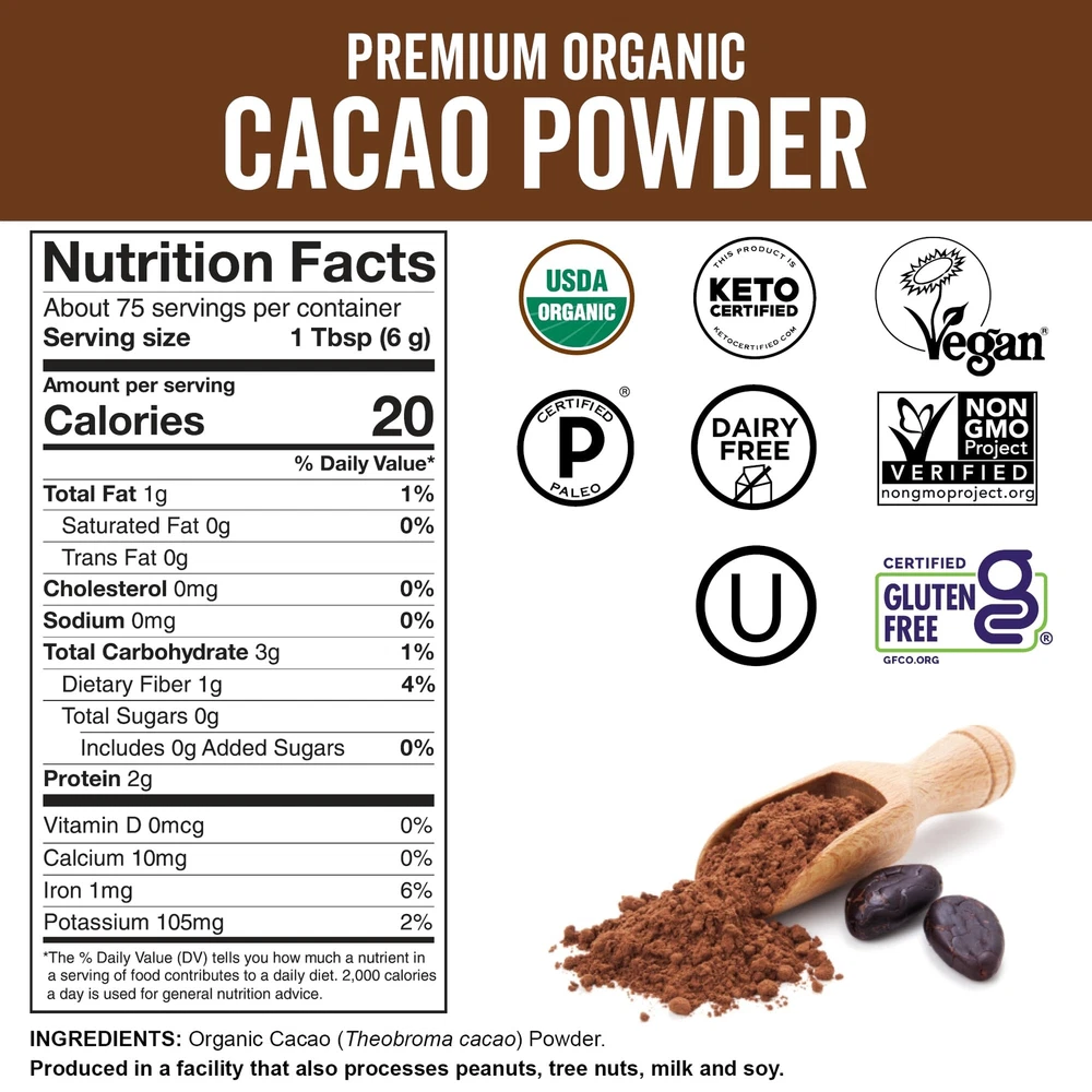 Organic Cacao Powder, 1lb - Unsweetened Cacao Powder With Rich Dark Chocolate Flavor, Perfect for Baking & Smoothies, Non-GMO, Certified Vegan & Gluten-Free, 454 g ORGANIC CACAO POWDER - Experience decadent, rich, dark chocolatey goodness with our pure, organic cacao powder. The aroma of rich dark chocolate not only tantalizes your senses but also delivers a guilt-free indulgence, crafted with no added sugar. BLENDS EASILY IN SMOOTHIES & HOT CHOCOLATE - Gently milled into a fine, silky powder without clumps or grittiness, our unsweetened cacao powder is an easy and delicious addition to your morning smoothie, shake, yogurt, oatmeal - you name it. THE IDEAL BAKING SUBSTITUTE - If you’re looking for an organic alternative to dark chocolate or cocoa powder, swap our cacao powder organic 1:1 for traditional organic cocoa powder in all your favorite cakes and cookie recipes. KETO, PALEO, VEGAN & GLUTEN FREE - Not only is our pure cocoa powder unsweetened, it is non-alkalized, gluten-free, Keto and Paleo, dairy-free, and kosher - a must-have kitchen staple. QUALITY YOU CAN TRUST - Forget fillers and additives. cacao powder is USDA-certified organic, Non-GMO Project Verified, and contains just one ingredient: organic dark cacao powder ground from the cacao beans of the Theobroma cacao tree. Shipping We offer FREE shipping on all orders! We ship within Three business days of payment, usually sooner. We use a selection of shipping services such as UPS, FedEx, USPS etc. We only ship to the lower 48 states, no APO/FPO addresses or PO Boxes allowed. Local pickups and combined shipping options are not provided at this time. Return You can return a product for up to 30 days from the date you purchased it. Any product you return must be in the same condition you received it and in the original packaging. Please keep the receipt. Payment We accept payment by any of the following methods: PayPal Please pay as soon as possible after winning an auction, as that will allow us to post your item to you sooner! Feedback Customer satisfaction is very important to us. If you have any problem with your order, please contact us and we will do our best to make you satisfied. Contact Us If you have any queries, please contact us via ebay. We usually respond within 24 hours on weekdays. Please visit our eBay store to check out other items for sale! Thank you for shopping at our store.