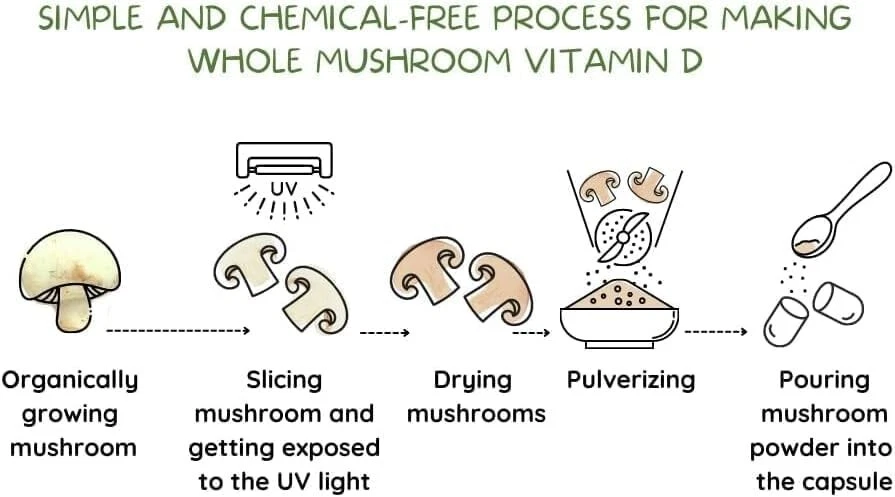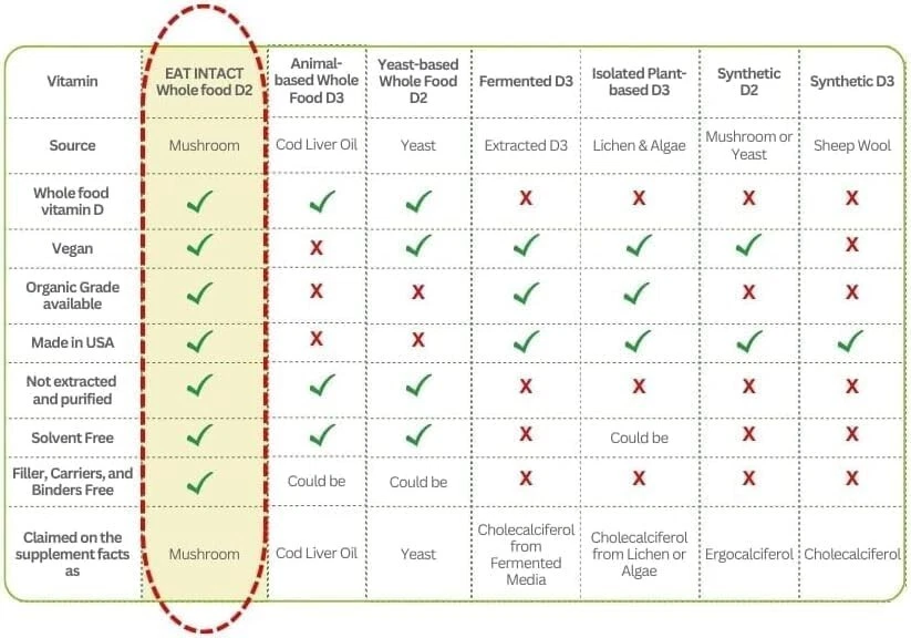 EATINTACT Organic Vegan Whole Food Vitamin D2, 2000 IU (50 mcg), Two Ingredients(Organic Whole Mushroom and Organic Vegan Capsule), Non-GMO, Third Party Tested, Support Strong Bone and Immune Health, 60 Day Supply Experience the unparalleled distinction of our product, the only organic, vegan, and truly whole food vitamin D. Our whole food vitamin D stands true to its name, produced organically from a single ingredient, whole mushrooms 🍄, rich in naturally boosted levels of Vitamin D. With our transparent and minimal process, we guarantee only the best for you. Our organically and sustainably grown whole mushrooms 🍄are exposed to UV light ☀️, mirroring the natural Vitamin D production in our bodies. Post-drying, these mushrooms are pulverized into fine powder and carefully encapsulated into organic capsules. Just two ingredients in our product - organic whole mushroom 🍄and veg organic capsule 💊 - exemplify our belief in simplicity and maximum efficacy. Assured quality is our motto, with every batch third-party tested ✔️for potency, heavy metals, and gluten, reinforcing our commitment to your well-being. Unlike other brands, we are happy to share our test results with you. If you're health-conscious, holistic enthusiast, vegan 🌿,and vegetarian, this is the best informed choice for you. Our Vitamin D ticks all the boxes, offering whole food, organic, non-GMO, components free from extraction, purification, solvents, binders, carriers, natural and artificial flavors, sweeteners, and colors. Proudly made in the USA, our whole mushroom Vitamin D is organically and sustainably grown, minimally processed, and encapsulated right here in the United States, ensuring the highest standards of quality and care. Satisfaction guaranteed 💯: We’re proud of our products. If you aren’t satisfied, we’ll refund you for any reason within 30 days of purchase.