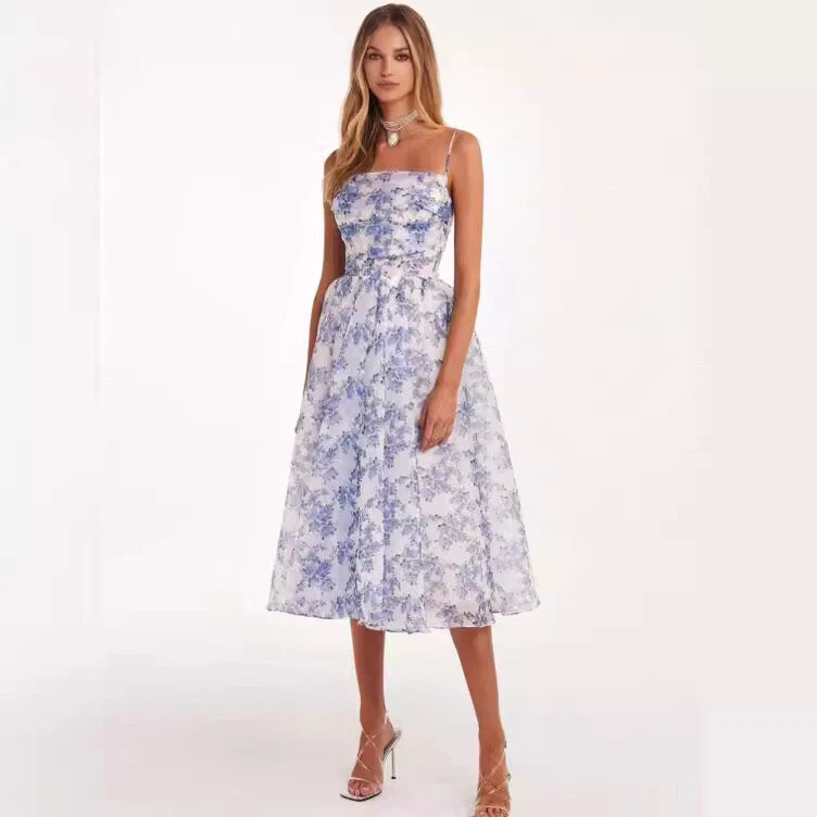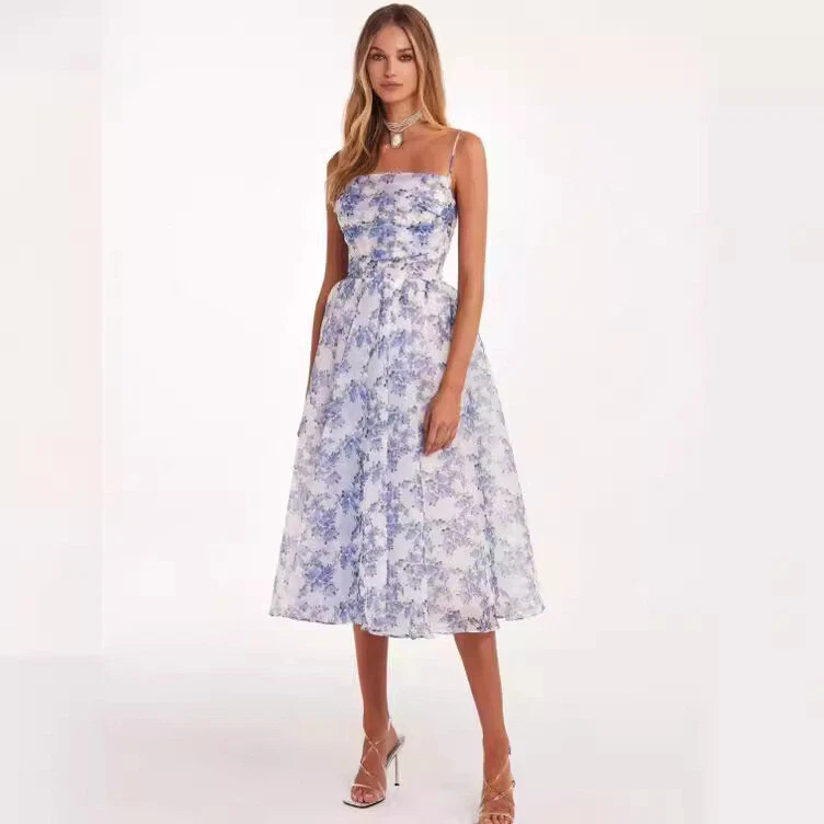 This charming midi-length dress features spaghetti straps, a flared skirt, and a fitted ruched bodice with a lace detail at the back. Made from printed organza in a pastel blue floral design, it offers a feminine silhouette. Key details include a square neckline, A-line shape. Shipping Information: Order Processing: Please allow 1-3 business days for us to process your order after payment. Shipping Time: Once processed, your order will be shipped and typically takes 7-14 business days to arrive at your destination. Size: International Size Chart International Size US Size Bust (cm) Waist (cm) Hips (cm) XXS 0 76 58 82 XS 0 80 62 86 XS 2 84 66 92 S 4 88 70 96 S 6 92 74 100 M 8 96 78 104 M 10 100 82 108 L 12 104 86 112 L 14 108 90 116 XL 16 112 94 120 Note: 1. Asian sizes are 1 to 2 sizes smaller than European and American people. Choose the larger size if your size between two sizes. Please allow 2-3cm differences due to manual measurement. 2. Please check the size chart carefully before you buy the item, if you don't know how to choose size, please contact our customer service. 3.As you know, the different computers display colors differently, the color of the actual item may vary slightly from the following images. Packing list: 1*Dress Product Image: