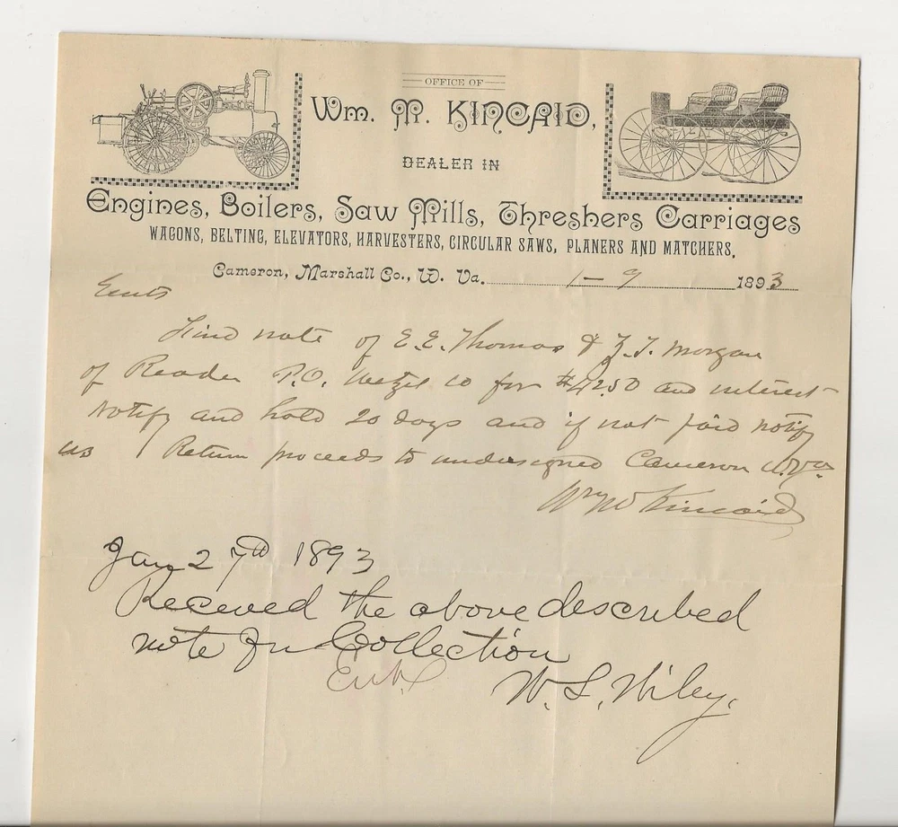 Original 1893 Graphic Illustrated Advertising Letterhead - WM. M. KINCAID. Moundsville, West Virginia. Dealer in Engines, Boilers. Saw Mills, Threshers. Carriages, etc. App.8 x 101/2 ins. DONT LIKE MY BUY IT NOW PRICES, LET'S PLAY AUCTION. Please view scans for condition and E-mail any questions.