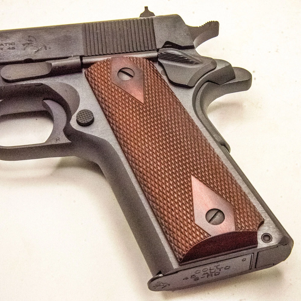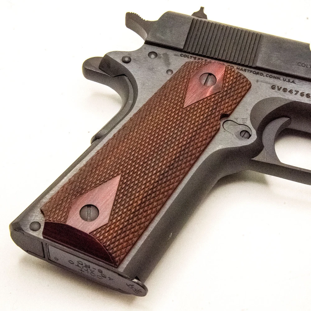 Original 1911 COLT Government Ambi Cut, Rosewood Double Diamond Pistol Grips These are the Original COLT manufactured Grips, came out of 1911 45ACP and 38 Supers. We customize guns and we change the grips to GOLD grip, so we liquidate the Original ones. Please bear in mind that these are original Rosewood, meaning the hue of the color might vary from pictures and from other grips, no two is alike. We will ship this item using USPS first class mail for FREE, we ship immediately in the same day of your payment or the next business day, tracking number will be provided, please allow up to 5 business days for delivery. We guarantee your satisfaction or your money back no questioned asked. Email me if you have a question. Thank you for your business.