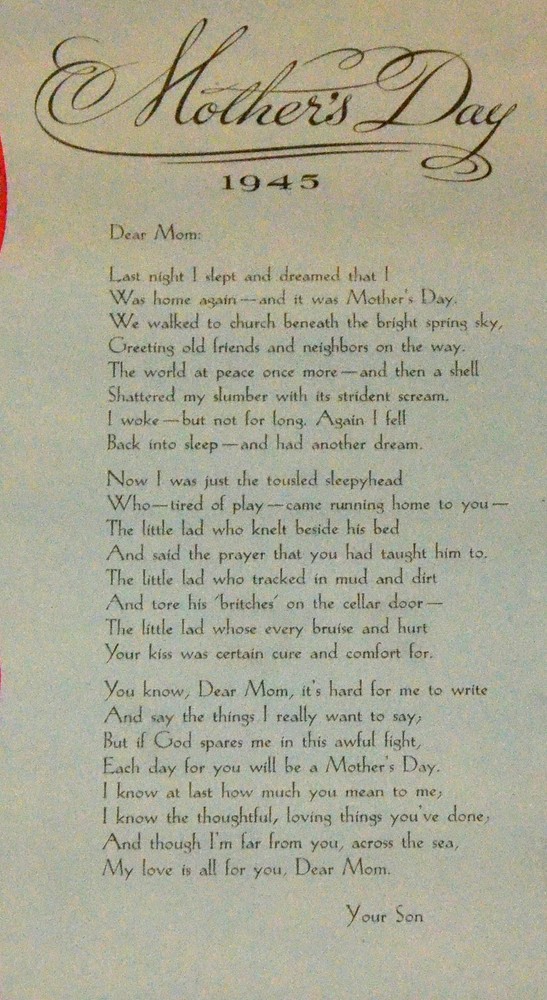 Here you have a wonderful bit of VINTAGE MOTHER'S DAY and WORLD WAR II MEMORABILIA! Please...SEE THE SCANS! This is AN EXTREMELY RARE ORIGINAL 1945 SOLDIER'S MOTHER'S DAY POEM that comes with its original mailing tube and company insert. You can read the moving words of the poem yourself by seeing the scans. (The watermarks are mine, not on the original.) This "MOTHER'S DAY" 1945 was originally read by CURLEY BRADLEY on the KC BAKING POWDER'S "KC JAMBOREE" carried on NBC radio stations. The company that produced the baking powder was JAQUES MANUFACTURING of Chicago. This gem measures 10 inches X 13 inches. The condition should be clear from the scans. THIS HAS NEVER BEEN USED! It came out of a box stored since World War II. There is some discoloration of the paper. The smaller enclosed note measures 6 inches X 3 inches. This is all gently treated and truly rare as a collection like this! This is a great piece FOR THE COLLECTOR! Take it home with you! Please Check Out My Ebay Store for more great memorabilia! I am happy to send this to any country. 1st class international air postage will be charged… More excellent packaging and free shipping here in the United States! THANKS! 050821