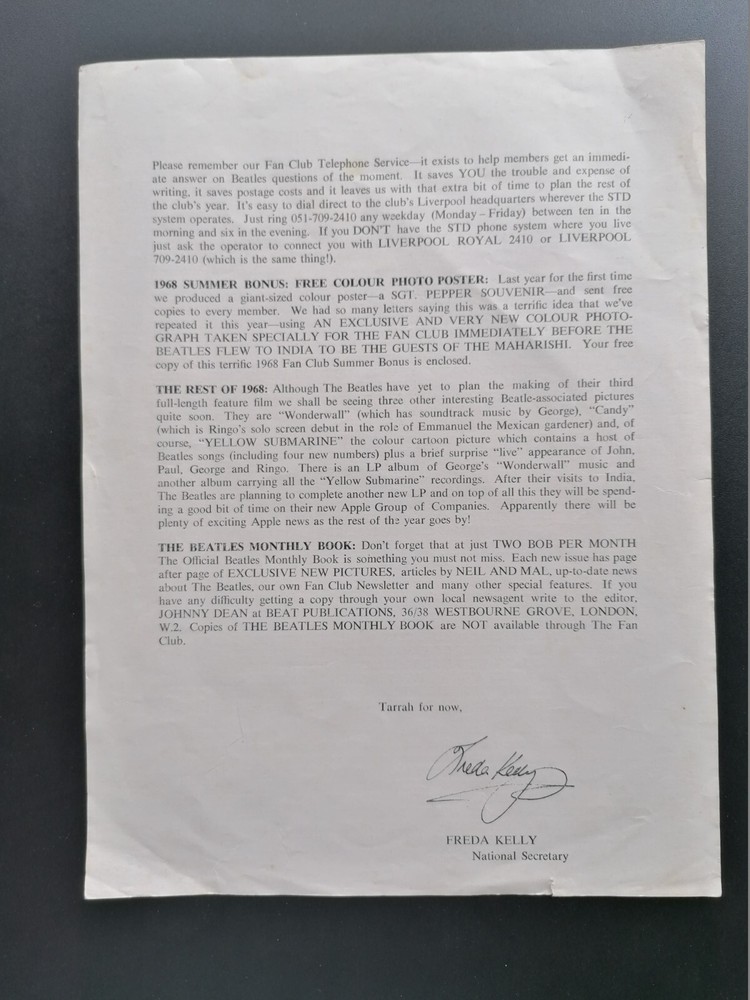 <DIV style="TEXT-ALIGN: center"><IMG border=0 src="https://ti2.auctiva.com/sw/java.gif"><BR> <TABLE align=center> <TBODY> <TR> <TD><A style="TEXT-DECORATION: none" href="https://www.ebay.co.uk/usr/paddysgoose" target=_blank><IMG border=0 src="https://ti2.auctiva.com/sw/noflash.gif"></A></TD> <TD height=27 vAlign=center align=middle><FONT size=2 face=arial><B><A href="https://www.ebay.co.uk/usr/paddysgoose" target=_blank>paddysgoose</A> Store</B></FONT></TD></TR></TBODY></TABLE></DIV> <IMG border=0 src="https://ti2.auctiva.com/web/aswCredit.gif"><BR><A href="https://ebaybusinessbuilder.com/listing-tools/#ebay-only-listing-tools" target=_blank><IMG border=0 src="https://ti2.auctiva.com/images/sc1line1.gif"></A> THIS IS A ORIGINAL 1968 SUMMER BEATLES FAN CLUB LETTER WITH FAN CLUB NEWS AND DETAILING EVENTS OF 1968 IT IS IN GOOD PLUS CONDITION