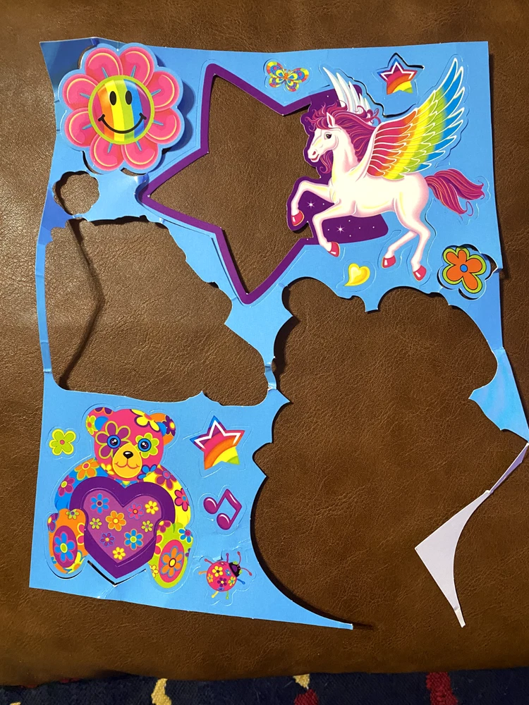 2 incomplete sheets from original 90's Lisa Frank Pop-Out collection (not stickers). Includes Dalmatian dogs, cats, pegasus, and other classics.