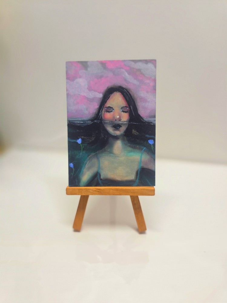 Title: Stay Afloat Year: 2026 Artist: Chasmar Design Format: ACEO (Art Cards, Editions & Originals) This listing is for an original, one-of-a-kind ACEO painting — not a print or reproduction. A soft, surreal portrait suspended between water and sky. With muted tones and gentle contrasts, this piece captures a quiet moment — balancing calm and vulnerability beneath a dreamlike surface. ✨ Details: Original handmade ACEO artwork (OOAK) Subject: Surreal portrait / floating figure / dreamy ocean scene Medium: Oil pastel and acrylic Surface: Watercolor paper Finish: Sealed with protective varnish Signed + titled + dated on the back Size: Standard ACEO (approx. 2.5 x 3.5 inches) 📦 SHIPPING (Tracked / eBay Standard Envelope) Ships via eBay Standard Envelope with tracking. Carefully packaged in a protective sleeve with rigid support to prevent bending during transit.