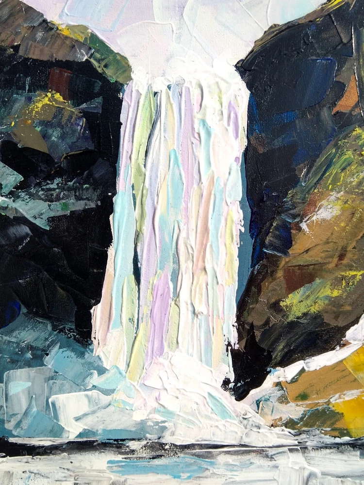 This painting is a journey for those who love to excel. A brutal vacation in rough boots and jackets with fur, or an interesting journey with loved ones filled with new discoveries and excellent views from the mountains to wild waterfalls and mirror reflections in the water. If you look closely, the waterfall shimmers in many shades, reflecting the rich sky in the seemingly cool climate. -ORIGINAL painting. This is not a copy or print. -Professional quality artists light fast acrylic paints on canvas using a palette knife. -Signature on the front and on the back. -Size: 70*50 cm. / 27.5x19.6" inches -Free shipping with tracking number west landscape painting,canvas impasto painting,3d painting,volumetric painting,mountains painting,waterfall canvas painting,wall art,original canvas painting,acrylic landscape painting,original art,original painting,palette knife painting,national park painting,north painting