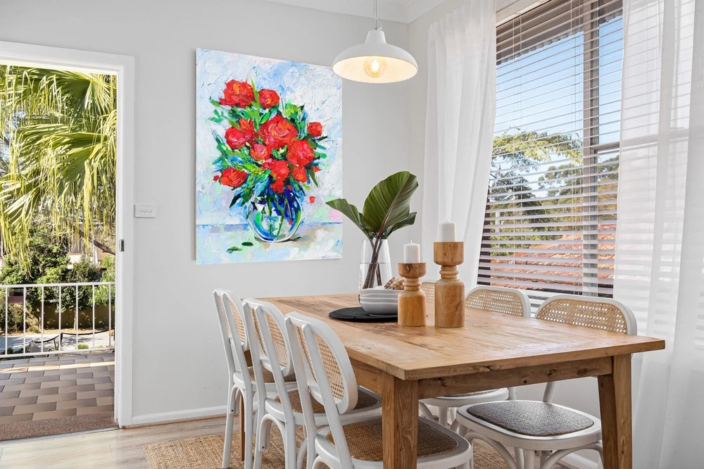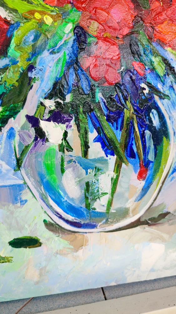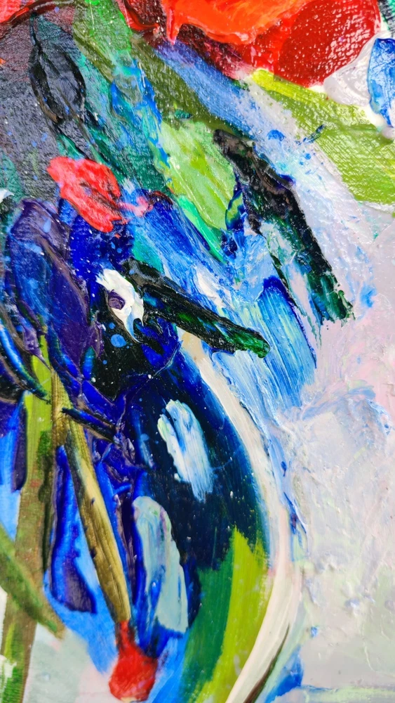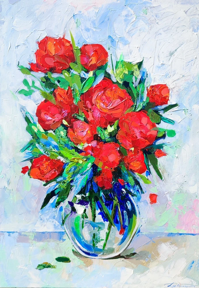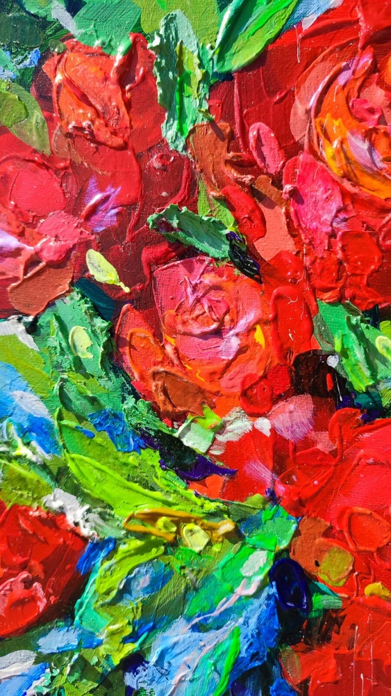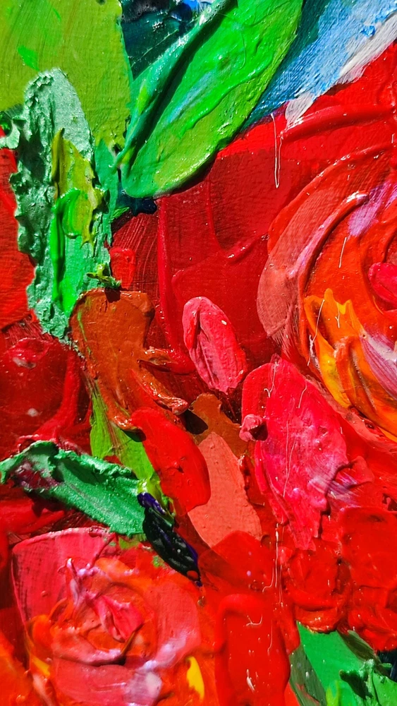 This picture seems to be inspired by nature itself and the splendor of its flowers. Charming red flowers immersed in lush green leaves create an indescribable impression of picturesque beauty and vitality. The impasto technique, with its rich, voluminous brush strokes, gives this painting tactility and texture, as if you can feel each stroke, as if touching flower petals. This art comes to life before your eyes, as if the flowers have just been cut from the garden and placed in a clear glass vase. Looking at this picture, you not only see beauty, but also feel its smell and freshness. It brings bright colors and positive emotions into your space, filling it with living natural beauty. This work of art will not only become part of your interior, but also a source of inspiration and joy every day. -ORIGINAL painting. This is not a copy or print. -Professional quality artists light fast acrylic paints on canvas using a palette knife. -Signature on the front and on the back. -Size: 70*50 cm. / 27x20" inches -Free shipping with tracking number Good vibes painting, optimistic painting, red flowers painting,canvas impasto painting,wall art,living room painting,kitchen painting,red flowers in vase painting,red bouquet painting,flowers art,flowers still life painting,flowers impasto painting, still life painting, bedroom painting, 3d wall art, focus on the good painting, kitchen flowers painting