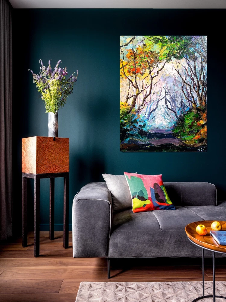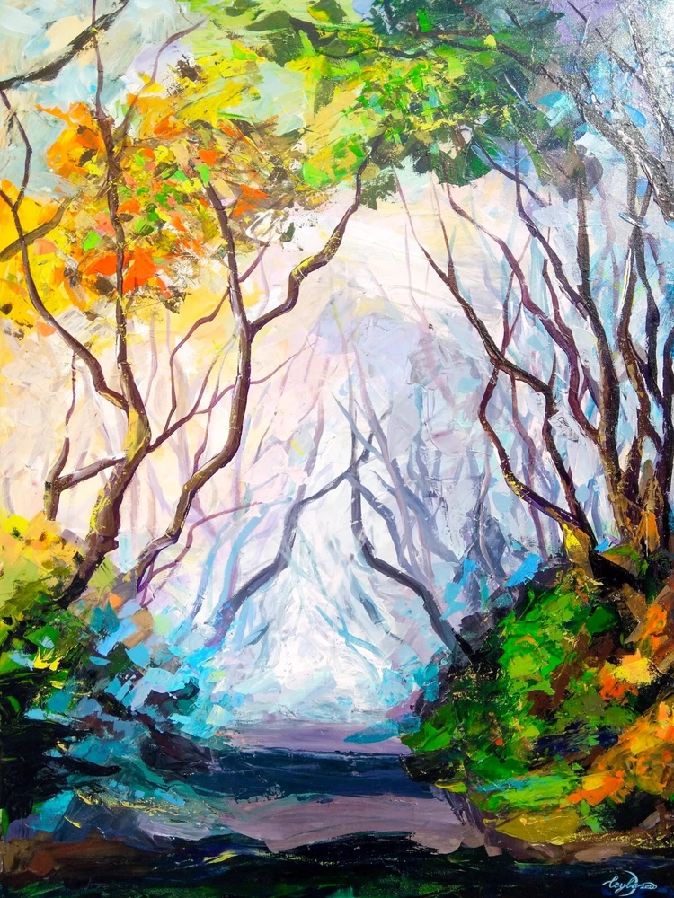 This stunning piece of art is a one-of-a-kind original acrylic painting titled "Attraction of the unknown". Created by the talented artist Leyla Zhunus, this contemporary artwork features a beautiful forest scene with trees and seasons. The painting is done on a medium-sized canvas using an impasto technique with a palette knife.The piece is signed by the artist and is unframed, allowing for personalized framing to match any décor. This handmade painting is perfect for nature, art, nautical, Americana, amusement parks, and tourism enthusiasts. With its unique theme and impressive production technique, this painting is a must-have for any art lover. -ORIGINAL painting. This is not a copy or print. -Professional quality artists light fast acrylic paints on canvas using a palette knife. -Signature on the front and on the back. -Size: 60*80 cm. / 31*23 inches -Free shipping with tracking number
