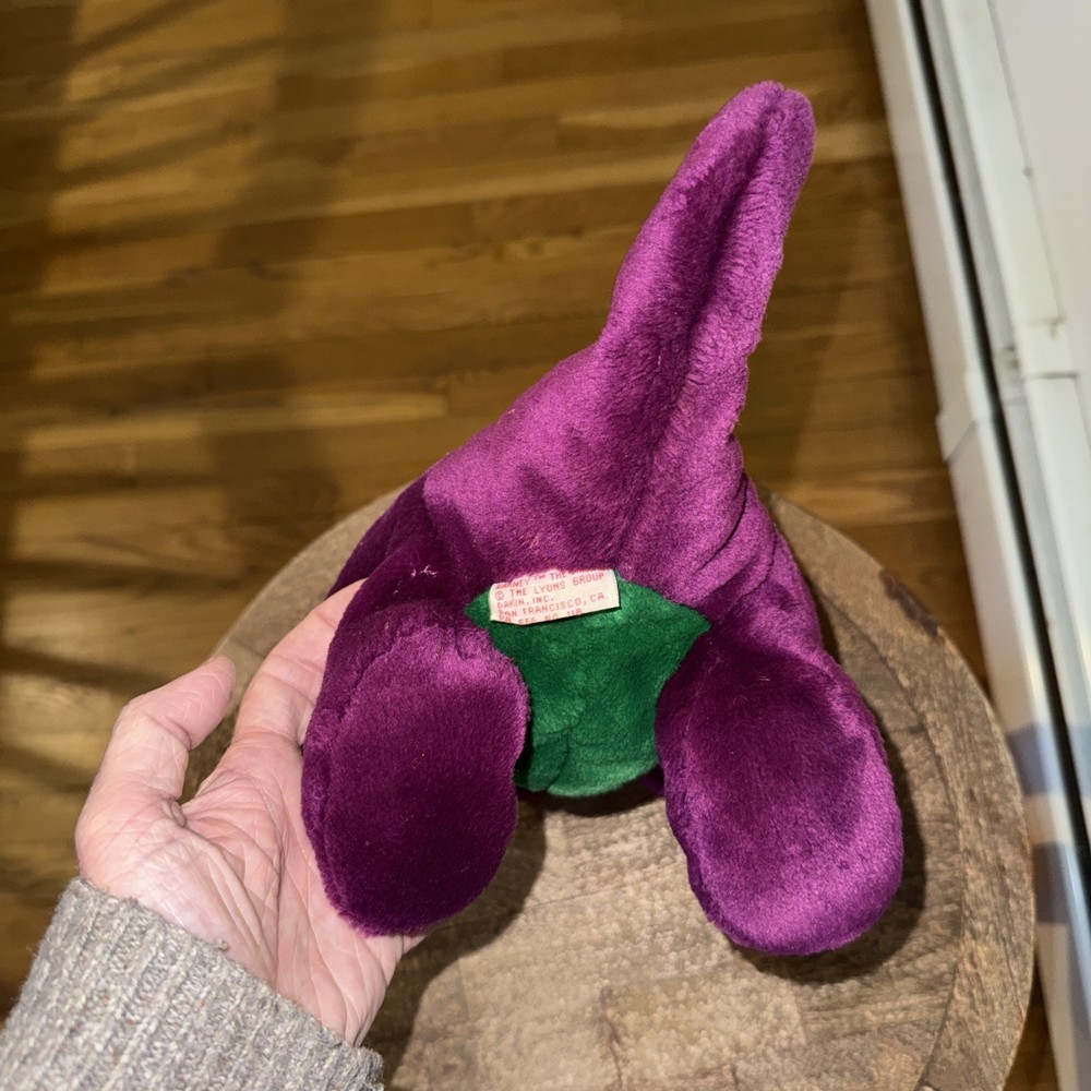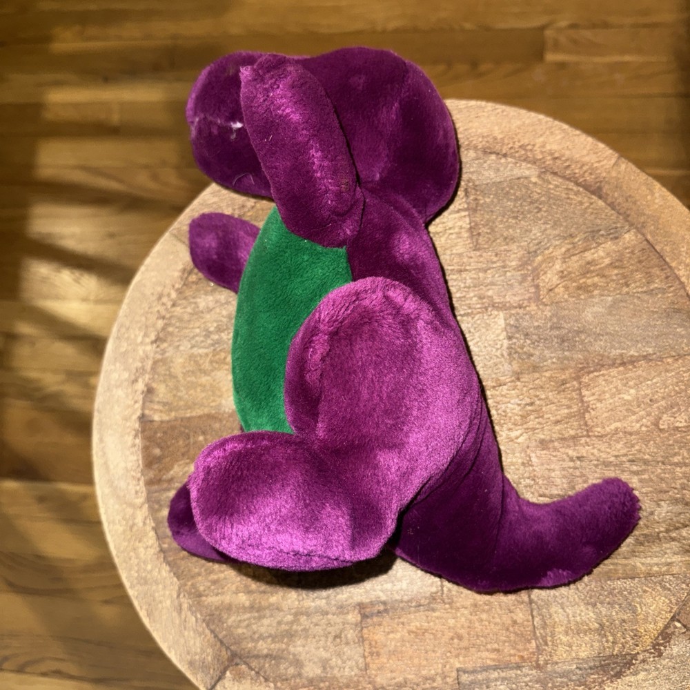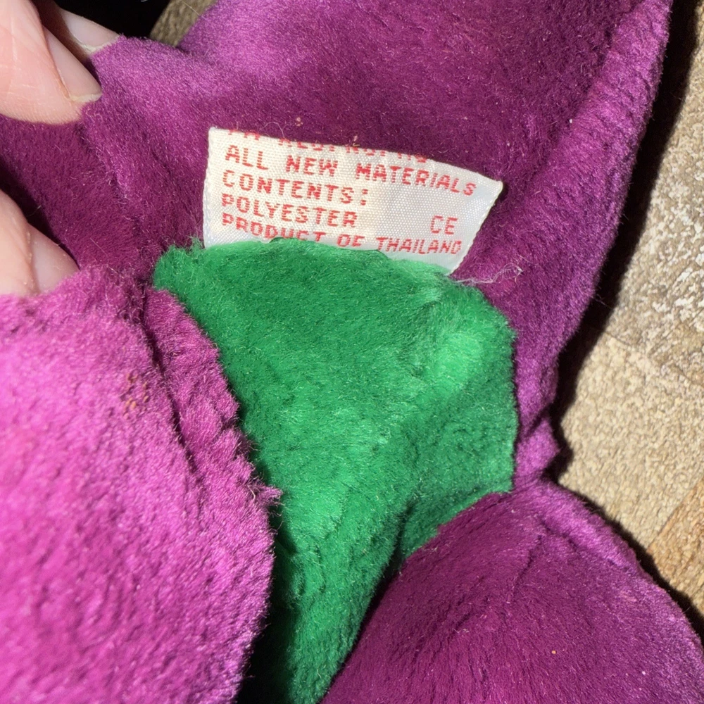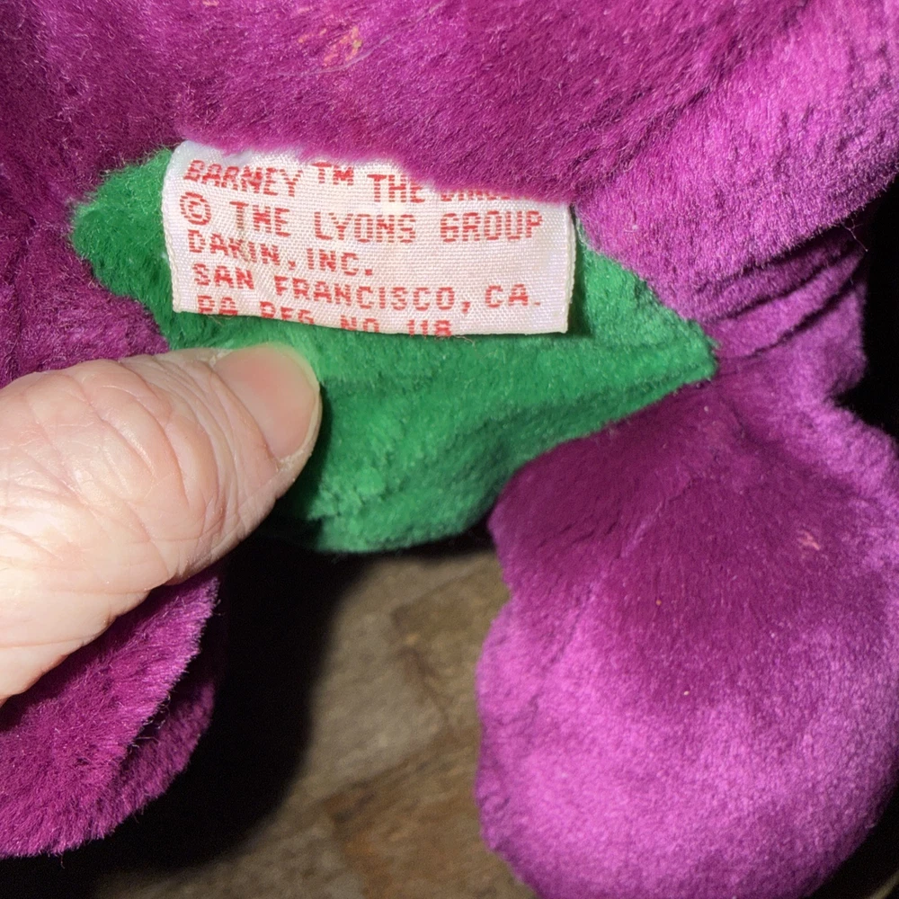 The Original Barney Plush with String Mouth by The Lyons Group Dakin, Inc is a small 10-inch stuffed animal from 1992. Made in Thailand, this vintage toy is part of the Barney & Friends character family, making it a sought-after collectible for fans of the popular children's show. Suitable for ages 3 and up, this plush Barney figure is a nostalgic piece that brings back memories of classic TV shows and childhood toys. The Original Barney Plush with String Mouth by The Lyons Group, made in Thailand by Dakin is a vintage 10" plush. This plush features the beloved character Barney from Barney and the Gang, prior to Barney and Friends. This rare collectors item is in mint condition. Non-smoking home. Original owner (worked for Barney). This first Barney plush was discontinued as the string mouth presented a choking hazard.