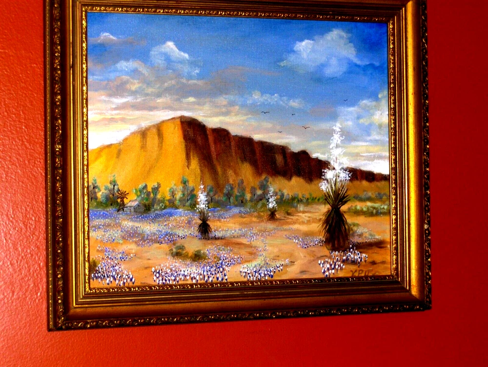 Bl uebonnet Landscape: Rural House, Water Will , Birds, Blooming Yucca, Rocks TX VINTAGE Oil on Canvas panel Excellent for your house!!! Or… Excellent Gift to make somebody happy!!! FAST SHIPPING!! Old Vintage Bluebonnet Landscape! GREAT VISION! Absolutely GORGEOUS ON THE WALL! A CLASSIC STYLE! This is an amazing impressionist painting, framed & ready to hung! Very beautifully done and very decorative. We feel deep emotions captured in this painting and they radiate a mysterious atmosphere. What a harmonious and peaceful landscape! It could remind us about a happy time in life! Signature is on the right side, but is very hard to read:K. P. H. This is an authentic handmade painting, not a giclee, not a reproduction! Medium Size for the frame, circa 20 x 17 Inches, and the painting inside is 17 x 14. Painting is in very good used condition, with minor imperfections, but none noticeable. THE FRAME IS FREE OF CHARGE, as complimentary to the painting! The payment is for the artwork only, not for the frame. We are always offering the frame as a gift, so you will have it at no additional cost, coming with your painting! It is in very good condition, with minor imperfections, tiny scratches and stains, but nothing noticeable. Very Elegant Painting! Just a beautiful piece - don't miss this one. Please enjoy checking on my other items and let me know if you would like any additional information. Thank you!