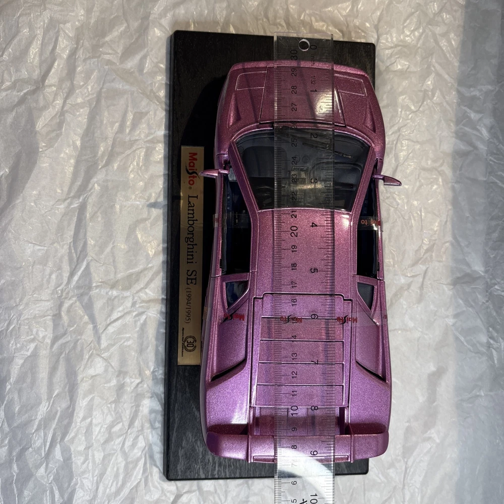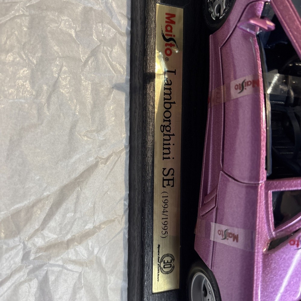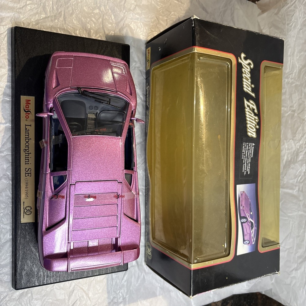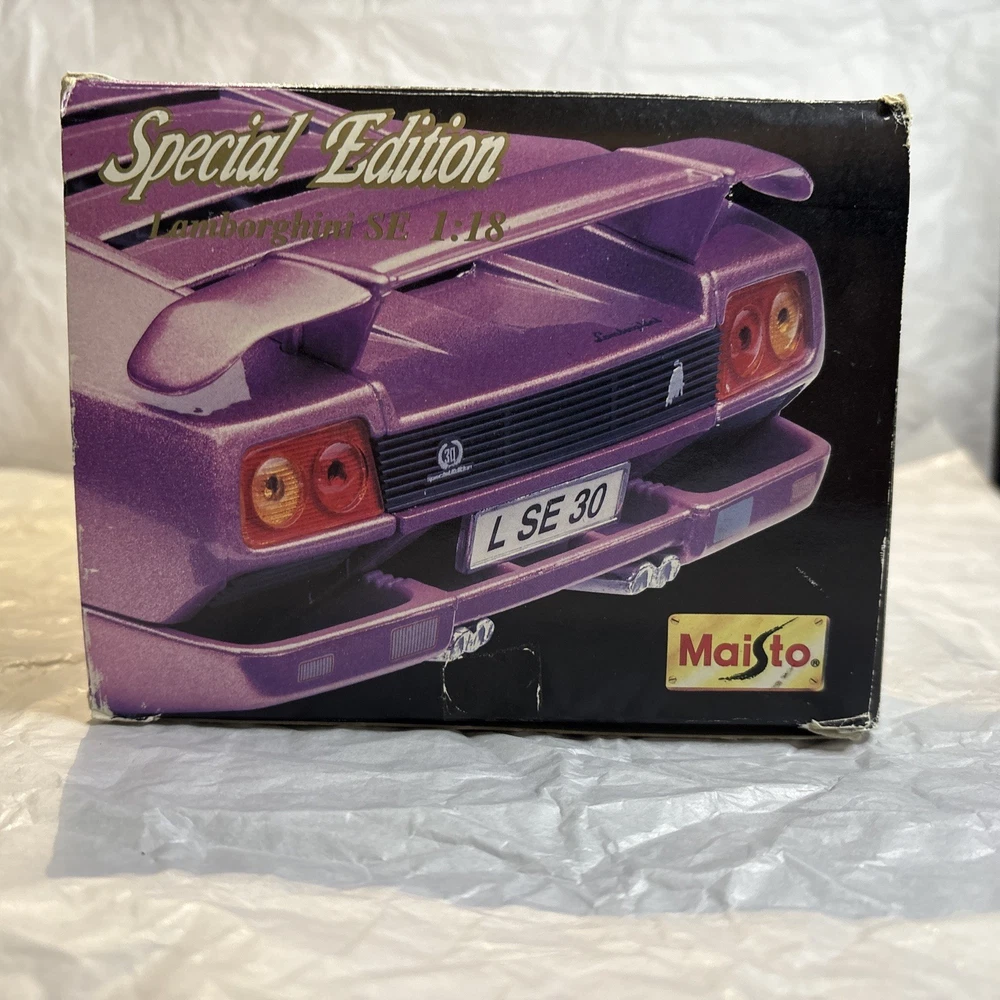 The Original Maisto Special Edition Diecast Model Car of the Lamborghini Diablo from 1994-1995 is a highly detailed collectible toy vehicle. This 1:18 scale model features a purple color scheme, specific to the Lamborghini Diablo SE model. Made from diecast material, this special edition version of the Lamborghini Diablo is a must-have for car enthusiasts and collectors alike. The intricate design and accurate representation of the vehicle make it a valuable addition to any diecast car collection. This was made to commemorate Lamborghini's 30th anniversary. Comes with original box (worn with one small hole in plastic) and mounted on display panel. Box is worn but car is in excellent condition. All moving parts are intact. Only taken out of box for photos for listing. Size is approximately one foot long on mount.