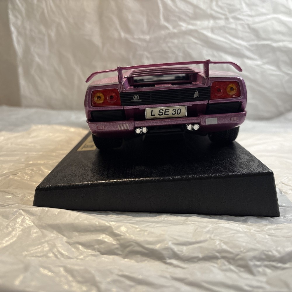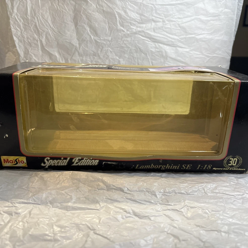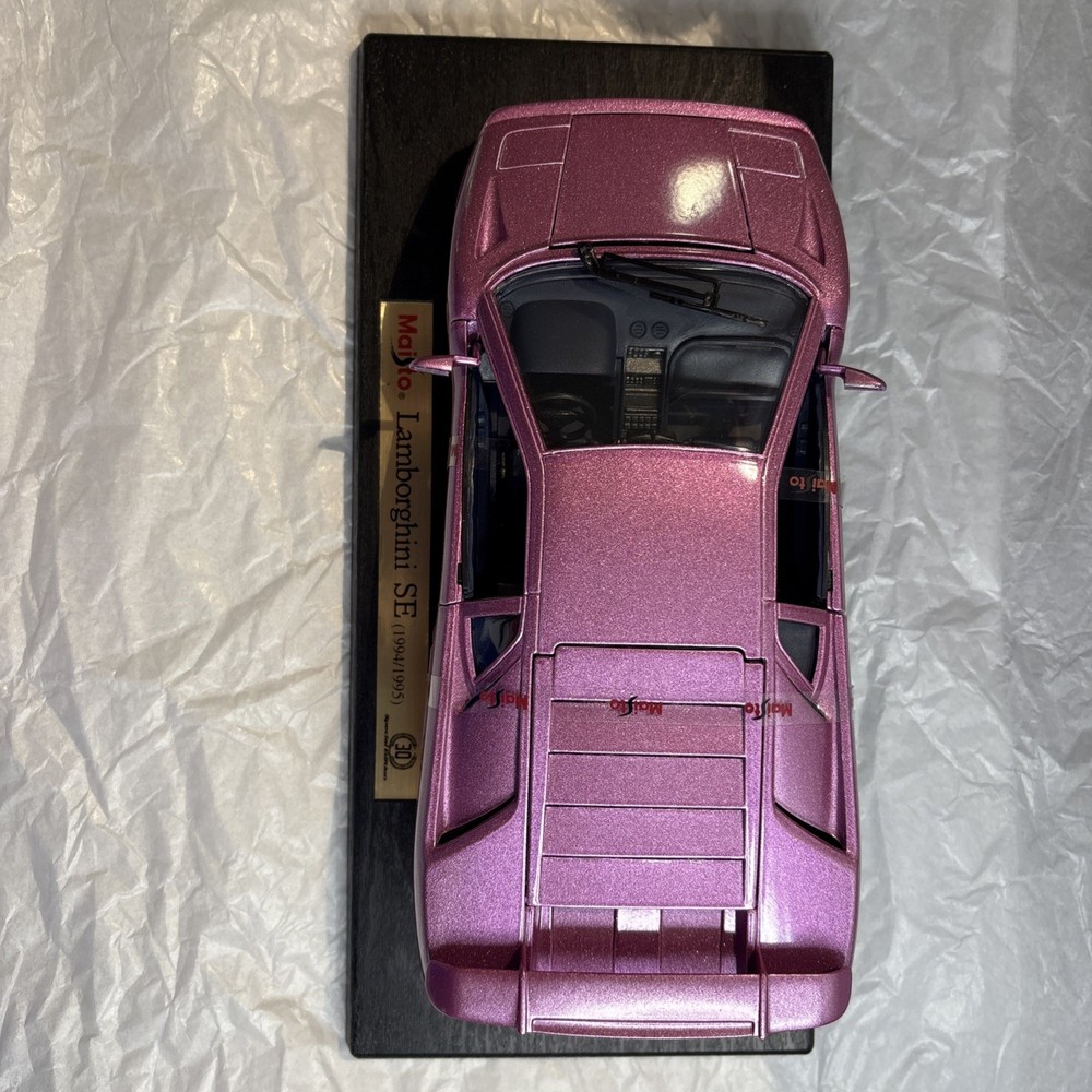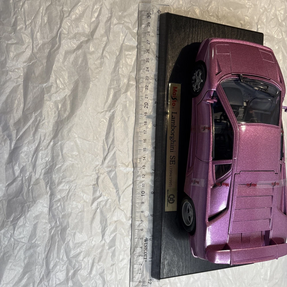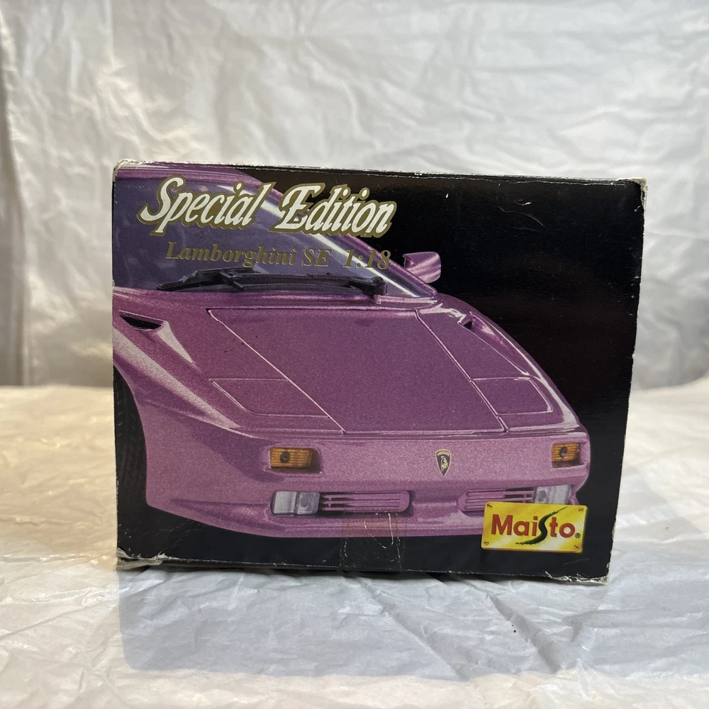 The Original Maisto Special Edition Diecast Model Car of the Lamborghini Diablo from 1994-1995 is a highly detailed collectible toy vehicle. This 1:18 scale model features a purple color scheme, specific to the Lamborghini Diablo SE model. Made from diecast material, this special edition version of the Lamborghini Diablo is a must-have for car enthusiasts and collectors alike. The intricate design and accurate representation of the vehicle make it a valuable addition to any diecast car collection. This was made to commemorate Lamborghini's 30th anniversary. Comes with original box (worn with one small hole in plastic) and mounted on display panel. Box is worn but car is in excellent condition. All moving parts are intact. Only taken out of box for photos for listing. Size is approximately one foot long on mount.