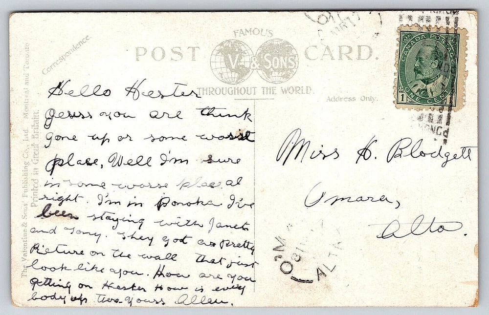 Subject: Horse Orientation: Horizontal Features: Divided Back, Stamp, Stamped, Original Genuine Antique Vintage Postcard City: Calgary, Alberta Signed By: Sender Size: Standard (5.5 x 3.5 in) Antique: Yes Country/Region of Manufacture: United States Color: Multicolor Original/Licensed Reprint: Original Theme: Animals, Architecture, Cities & Towns, Community Life, Cowboys & Western, Cultures & Ethnicities, Famous Places, Fashion, Historical Figures, Landscapes, People, Seasons, Social History, Transportation, Travel UPC: DOES NOT APPLY Postage Condition: Posted Time Period Manufactured: NA Unit of Sale: Single Unit gtin13: DOES NOT APPLY Finish: Glossy Type: Original Genuine Antique Vintage Postcard Stamp: Yes Country: Canada Material: Paper Brand/Publisher: Valentine & Sons Publishing Era: Divided Back (1907-1915) Location: Calgary, Alberta Canada Posted: Yes Signed: Yes Vintage: Yes Continent: North America Featured Person: People Number of Items in Set: 1 Region: Alberta Seller Notes: “Good Vintage Condition. See Pictures And Description Closely For Details.”
