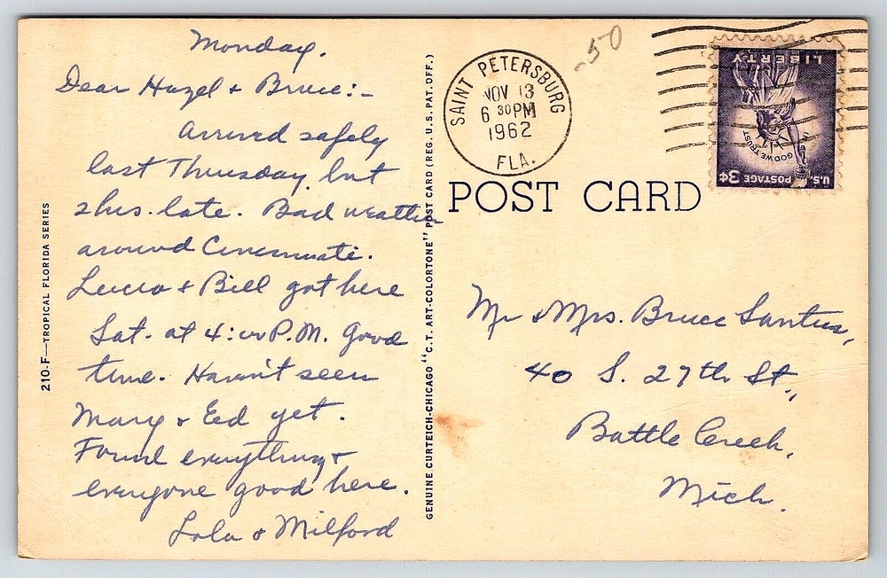 Signed: Yes Seller Notes: “Good Vintage Condition.” Features: Divided Back, Stamp, Stamped, Original Genuine Antique Vintage Postcard Vintage: Yes Size: Standard (5.5 x 3.5 in) Signed By: None, Sender UPC: DOES NOT APPLY Country: United States Stamp: Yes Year Manufactured: 1962 Era: Divided Back (1907-1915) Material: Paper Character: Postcard gtin13: DOES NOT APPLY Original/Licensed Reprint: Original Unit of Sale: Single Unit Postage Condition: Posted Type: Mail Old Genuine Original Postcard Card Image Picture Antique Number of Items in Set: 1 Artist: Postcard Occasion: Postcard Continent: North America Country/Region of Manufacture: United States Brand/Publisher: Curt Teich Theme: Community Life, Domestic & Family Life, Famous Places, Floral & Gardens, Flowers & Plants, Landscapes, Roadside America, Seasons, Social History Posted: Yes Finish: Matte Time Period Manufactured: 1960-1969 City: Florida Color: Multicolor Subject: Flowers Orientation: Horizontal Franchise: Postcard Featured Person: None Region: Florida Antique: Yes