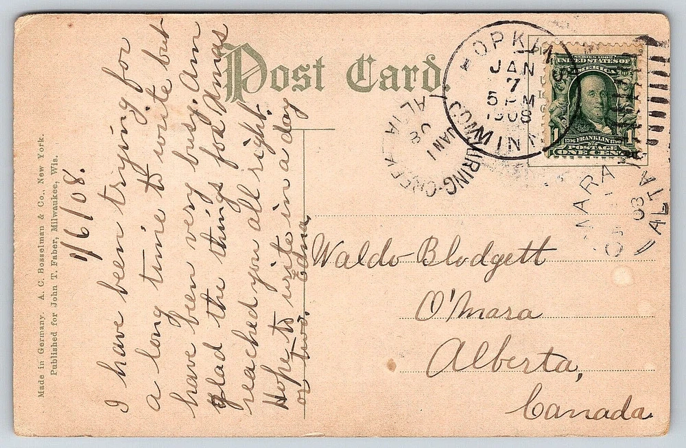 Stamp: Yes Country/Region of Manufacture: Germany Original/Licensed Reprint: Original Year Manufactured: 1908 Color: Multicolor Type: Original Genuine Antique Vintage Postcard Posted: Yes Location: Minneapolis, Minnesota USA Brand/Publisher: A.C. Bosselman & Co. Orientation: Horizontal Antique: Yes Vintage: Yes Size: Standard (5.5 x 3.5 in) Era: Divided Back (1907-1915) Country: United States Signed: Yes Seller Notes: “Good Vintage Condition. See Pictures And Description Closely For Details.” Signed By: Sender Unit of Sale: Single Unit Material: Paper Finish: Matte UPC: DOES NOT APPLY Postage Condition: Posted Number of Items in Set: 1 Subject: Cities & Towns Time Period Manufactured: 1900-1919 Features: Divided Back, Stamp, Stamped, Original Genuine Antique Vintage Postcard Continent: North America Theme: Architecture, Cities & Towns, Community Life, Domestic & Family Life, Famous Places, Historical Figures, Landscapes, Nautical, Roadside America, Seasons, Social History, Technology, Postcard, Antique, Vintage, Ephemera, Collectible, Memorabilia, Old, Retro, History, Card, Mail, Paper City: Minneapolis Featured Person: None gtin13: DOES NOT APPLY