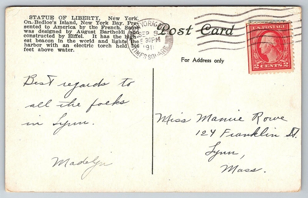 Stamp: Yes Signed By: Sender Postage Condition: Posted Material: Paper Features: Divided Back, Stamp, Stamped, White Border, Original Genuine Antique Vintage Postcard Unit of Sale: Single Unit Country: United States Occasion: Postcard Year Manufactured: 1911 Franchise: Postcard Number of Items in Set: 1 Featured Person: None gtin13: DOES NOT APPLY Orientation: Vertical Era: Divided Back (1907-1915) Posted: Yes Vintage: Yes Country/Region of Manufacture: United States Brand/Publisher: Unbranded Original/Licensed Reprint: Original Continent: North America UPC: DOES NOT APPLY Color: Multicolor Antique: Yes Subject: Statue Type: Mail Old Genuine Original Postcard Card Image Picture Antique Theme: Architecture, Cities & Towns, Community Life, Domestic & Family Life, Famous Places, Historical Figures, Landscapes, Nautical, Patriotic, Roadside America, Seasons, Social History, Tourism Region: New York Seller Notes: “Good Vintage Condition.” Time Period Manufactured: 1900-1919 Size: Standard (5.5 x 3.5 in) Signed: Yes Artist: Postcard Finish: Matte Character: Postcard City: New York City