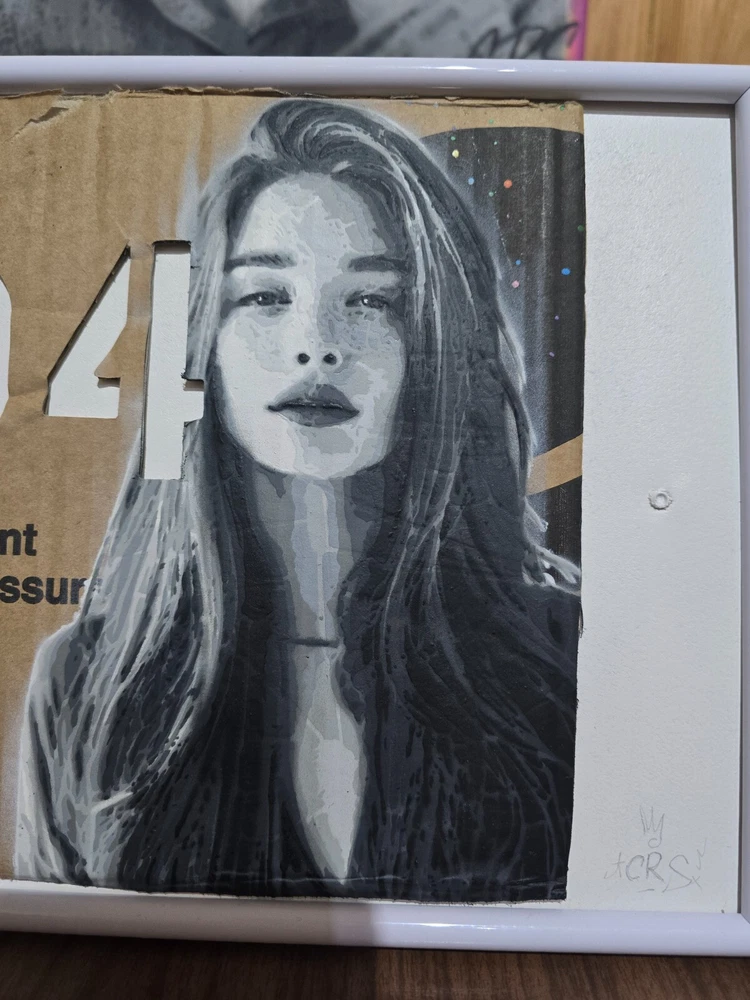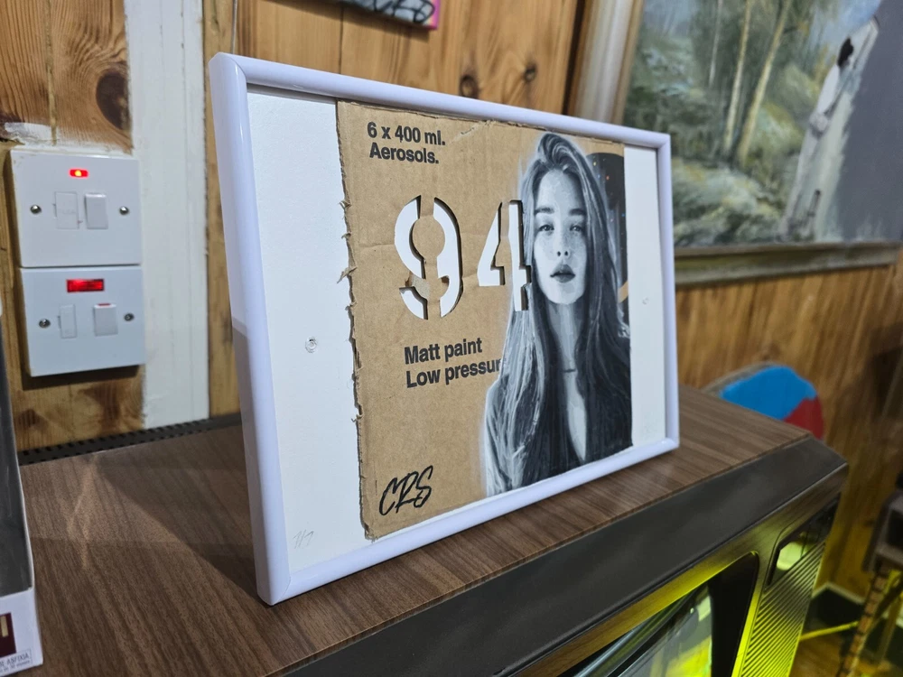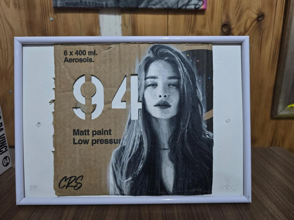 Introducing an original painting by CRS, known as the Banksy of Cyprus. This one-of-a-kind piece features a realistic portrait of a subject, painted on cardboard using spray techniques. The artist has signed the painting and provided a Certificate of Authenticity (COA) for its originality. Measuring small in size, this painting has been framed and personalized by the artist. It is a handmade piece that showcases the art of stencil art and is perfect for any art enthusiast. Produced in 2024, this painting is a unique addition to any collection and is sure to impress.