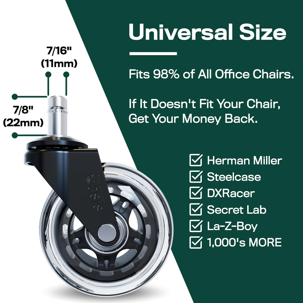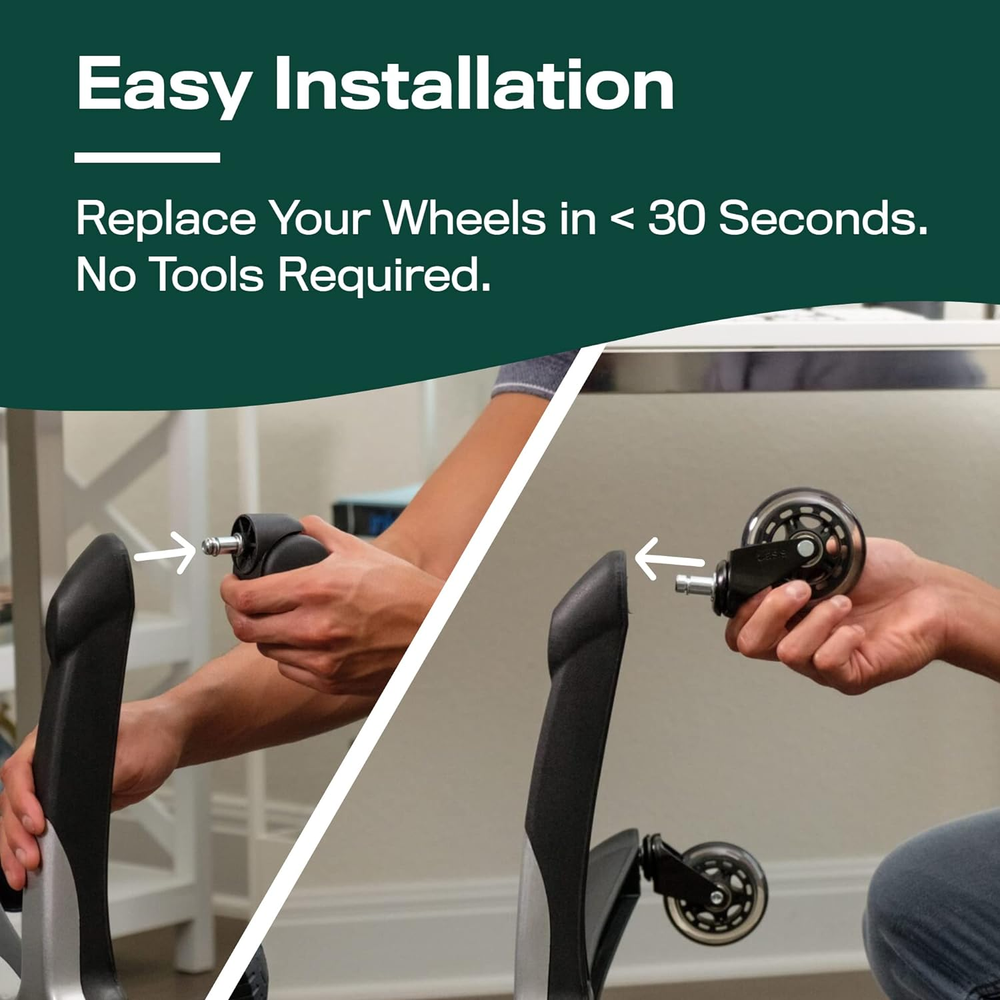 ★ LIFETIME WARRANTY - Our warranty never expires, so if you EVER have any issues, we'll send you a brand new set of wheels. We’re the only brand that offers and stands behind a full lifetime warranty. ★ SAFE FOR ALL FLOORS - Many chair wheels use cheap, low quality materials that destroy your flooring. We don't. Encased with soft, polyurethane material our rollerblade style wheels are guaranteed not to scratch or leave marks on any surface (including hardwood, carpet, tile, laminate and more). ★ QUICK AND EASY INSTALLATION - No tools required! Easily remove and replace the wheels in your desk chair in less than 30 seconds. Simply pull out your old caster wheels and pop these in. Check out our quick replacement video for more details. ★ UNIVERSAL SIZE - Upgrade any rolling office chair with these smooth caster wheels. The universal size stem will fit almost every office chair on the market, except IKEA, for those check out our IKEA Chairs Only size. If for some reason they don’t fit your specific chair, we’ll gladly take care of you. ★ SUPPORTS UP TO 650 LBS - Manufactured with the best available materials these casters are built to last a lifetime. Heat treated high-grade steel, precision ball bearings, and durable polyurethane provide years of effortless rolling. The heavy duty chair wheels easily support 650 lbs. Product Description The video showcases the product in use. The video guides you through product setup. The video compares multiple products. The video shows the product being unpacked. Safe For All Floors The Original Rollerblade Chair Wheels We're a small business from Columbus Ohio , and the original designer of rollerblade wheels for office chairs. These wheels are incredibly smooth, quiet, and safe for all floors (including wood floors). 1 Safe for All Floors 2 Hardwood 3 Carpet 4 Laminate / Vinyl / Tile Find Your Match: Office Chair Wheels for Any Workspace Add to Cart Add to Cart Add to Cart Add to Cart Add to Cart Add to Cart Customer Reviews 4.8 out of 5 stars 30,771 4.8 out of 5 stars 30,771 4.8 out of 5 stars 30,771 4.8 out of 5 stars 30,771 4.8 out of 5 stars 30,771 4.8 out of 5 stars 30,771 Price $39.95 $ 39 . 95 $42.95 $ 42 . 95 $42.95 $ 42 . 95 $39.95 $ 39 . 95 $42.95 $ 42 . 95 $42.95 $ 42 . 95 Color Clear Black Blue Red White Clear IKEA Safe for All Floors ✔ ✔ ✔ ✔ ✔ ✔ Easy Installation ✔ ✔ ✔ ✔ ✔ ✔ Universal Size ✔ ✔ ✔ ✔ ✔ ✘ IKEA Chairs Compatible ✘ ✘ ✘ ✘ ✘ ✔ Universal Size - Fits 98% of All Office Chairs These chair casters are the universal size and fit 98% of all office chairs on the market. If they don't fit your specific chair, no problem, we'll take care of you. The video showcases the product in use. The video guides you through product setup. The video compares multiple products. The video shows the product being unpacked. Simple Chair Wheel Replacement Quick & Easy Installation No tools required! Replacing your chair wheels is easy and takes less than a minute . Simply pull out your old caster wheels and push the new ones in. Small Business Shares Their Story Featured on PBS Show Start Up Co-founders of The Office Oasis, Meredith and Kevin, were featured on the PBS show Start Up. They shared their story on how they started a growing e-commerce business with just one simple idea. The video showcases the product in use. The video guides you through product setup. The video compares multiple products. The video shows the product being unpacked.