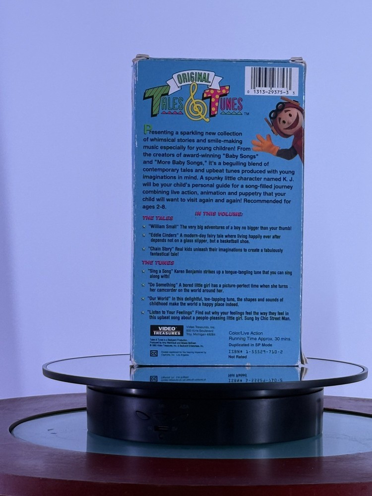 "Original Tales & Tunes" is a live-action VHS tape from 1992 that features a collection of classic children's stories and songs in English. The tape includes a mix of action, adventure, fairy tales, fantasy, comedy, and musical performances, making it a versatile and entertaining option for young viewers. Produced by Video Treasures, this VHS tape offers a nostalgic viewing experience for families and fans of timeless children's tales.