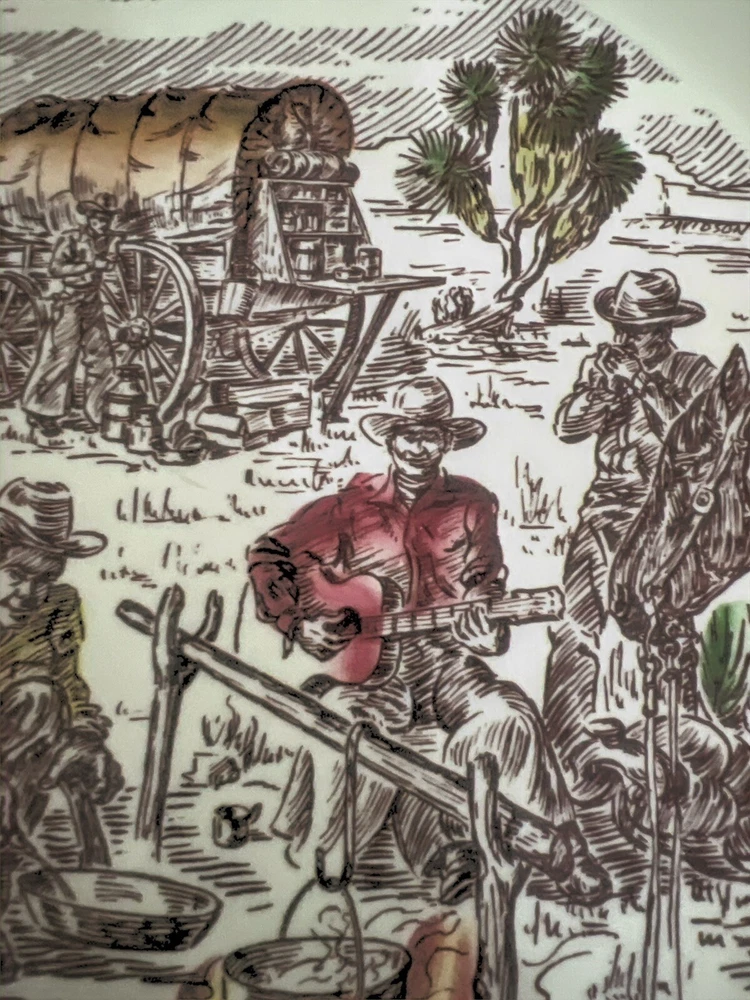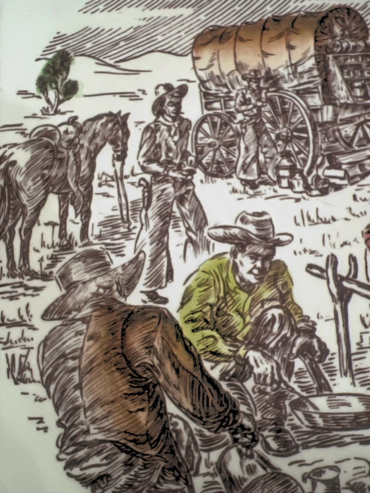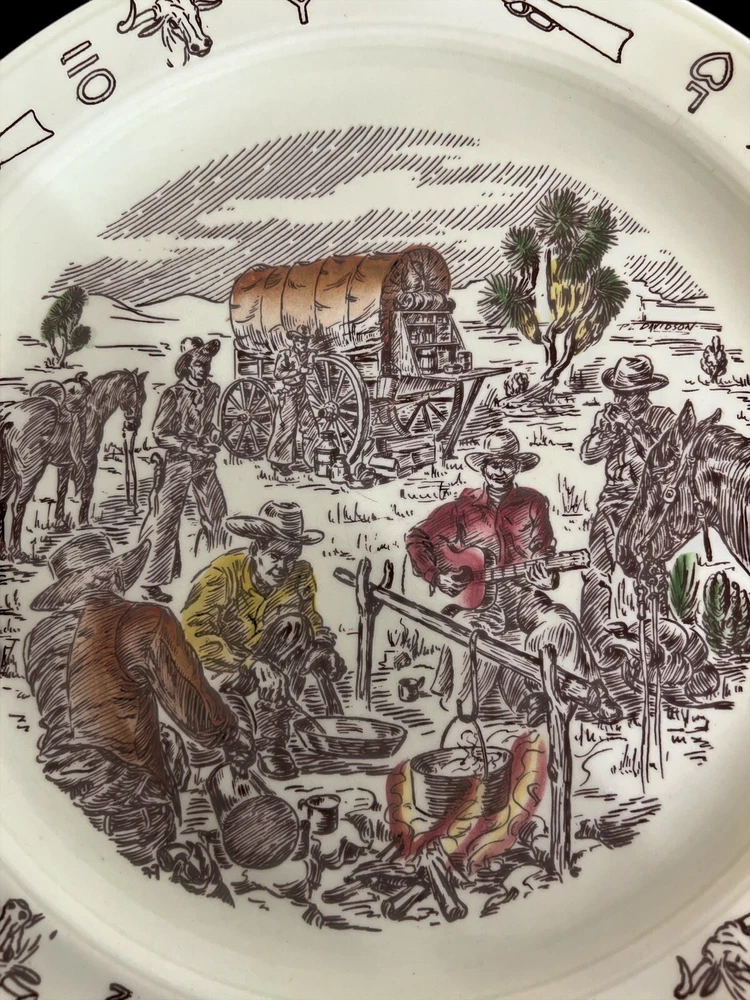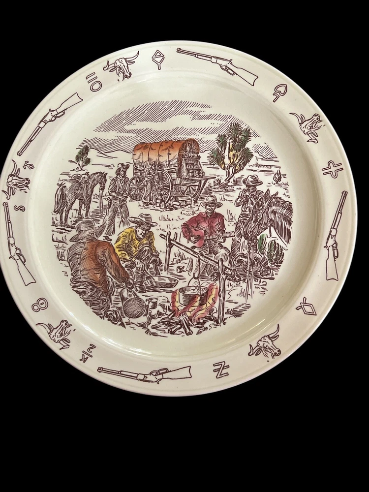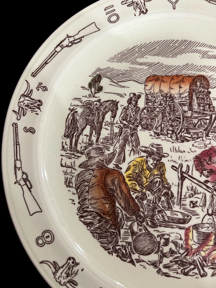 Vernon Kilns California USA, Winchester ‘73 “Frontier Days” Pattern of Covered Wagon and Cowboys by the Campfire. Hand Painted Ceramic 10.5” Diameter Dinner Plate. Excellent Condition. Smoke/Pet Free Environment. Vernon Kilns produced the Winchester '73 pattern in 1950 to coincide with the release of Universal International's picture of the same name. It was produced until 1953 when the name was changed to Frontier Days, which was produced until 1954. Artwork is by Paul Davidson.