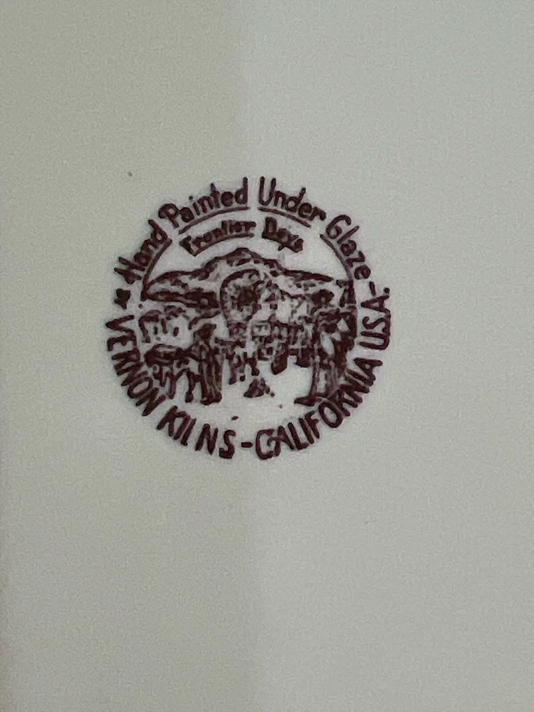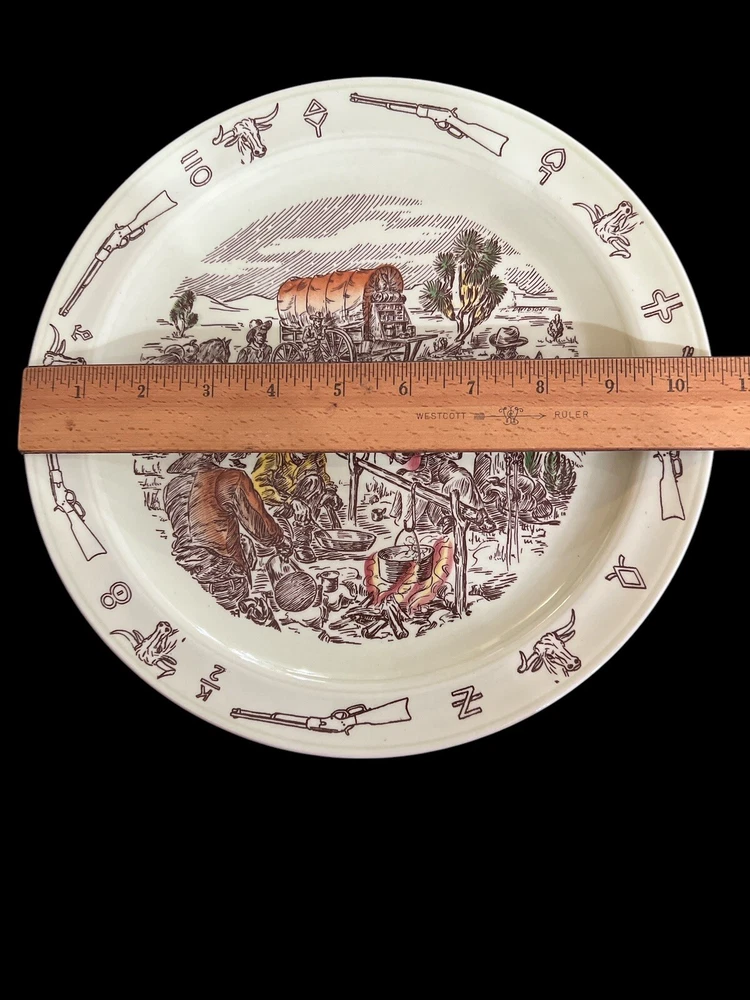 Color: Multicolor Occasion: All Occasions Plate Diameter: 10.5” Backstamp: Printed Material: Ceramic Number of Items in Set: One Piece Production Style: Art Pottery Features: Hand Painted Type: Dinner Plate Country/Region of Manufacture: United States Production Technique: Pottery Era: Mid 20th Century (1941-1969) Origin: California Antique: No Style: Western Theme: Frontier Days Covered Wagon Time Period Manufactured: 1950-1959 Pattern: Frontier Days Vintage: Yes Finish: Glossy Shape: Round Care Instructions: Hand Wash Only Original/Licensed Reproduction: Original Brand: Vernon Kilns Set Includes: Dinner Plate