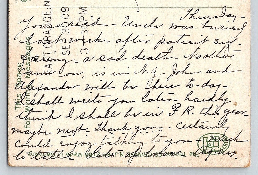 WELCOME TO People And Places Of The Past Here you will find unique antique photographs, real photo postcards, and other vintage postcards that can be used for collecting, genealogy, or crafting. Many of these historic photographs are rare, hard to find, and are one-of-a-kind images that cannot be found anywhere else. Please visit our ebay store and Thank You for shopping with us! This vintage, antique post card is in good condition. Please see high resolution pictures of the front and back of this card closely for detailed cosmetic condition prior to purchase. This post card measures 3.50 inches x 5.50 inches. This post card will be shipped to you packaged well inside of a clear plastic sleeve, inside of a quality 250 GSM rigid, stay flat envelope to keep the card flat and to protect the card during shipping within the United States. A FRAGILE or DO NOT BEND sticker will be applied to the outside of the envelope. Your post card will be delivered to the post office the same day, or the next business day, after receiving payment. Bad weather and holidays can affect delivery times. Returns are accepted within 30 days of purchase. Shipping Options: Choose One That Is Best For You For Cost And Speed Of Delivery 1. EBAY STANDARD ENVELOPE ( Standard USPS First Class Mail ) - Basic protection with no tracking or minimal tracking with this option. 3 - 6 business days estimated delivery. 2. USPS GROUND ADVANTAGE - Full bar code tracking available with this option. Cardboard protection added around postcard. 2 - 5 business days estimated delivery. 3. USPS PRIORITY MAIL - Full bar code tracking available with this option. Cardboard protection added around postcard. 1 - 4 business days estimated delivery. Each item is inspected, packaged, weighed, and sealed individually for FAST SHIPPING! We try our best to represent the item in the images as accurately as we can. However, due to variations in color in image scanners, computer screens, and cell phone displays, the color may be slightly different than the actual product. Vintage post cards and photographs can show normal signs of wear associated with an antique image including curling, bends, folds, creases, holes, dents, stains, rips, scratches, worn edges, fading, crackling, handwriting, fingerprints, postage cancellations, postage stamps, missing pieces, paper or glue residue from being put into or taken out of old postcard/photograph albums, other damage that may not show up from the image scanner, or out of focus by the original photographer. They will have imperfections from being mailed and/or due to their antique age. Thank You For Shopping With People And Places Of The Past! Visit our ebay store at www.ebay.com/str/peopleandplacesofthepast