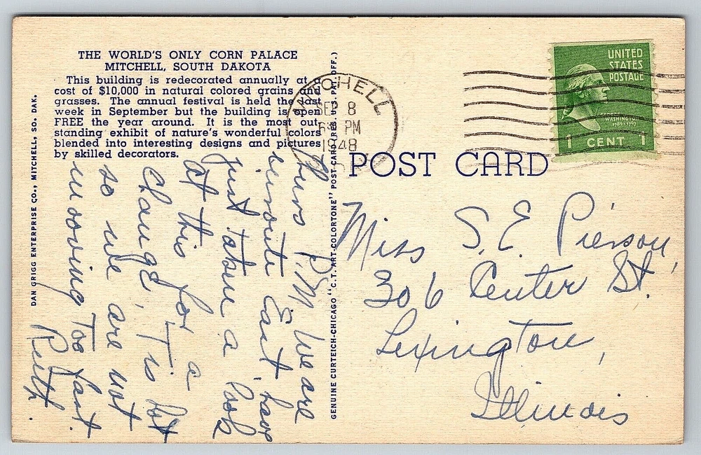 Artist: Postcard Signed By: Sender Brand/Publisher: Curt Teich Unit of Sale: Single Unit Stamp: Yes Occasion: Postcard Signed: Yes Material: Paper Orientation: Horizontal Country/Region of Manufacture: United States Region: South Dakota Color: Multicolor Postage Condition: Posted Year Manufactured: 1948 Subject: Cities & Towns Number of Items in Set: 1 Character: Postcard Type: Mail Old Genuine Original Postcard Card Image Picture Antique Seller Notes: “Good Vintage Condition.” Time Period Manufactured: 1940-1949 Continent: North America Country: United States Vintage: Yes Era: Divided Back (1907-1915) Theme: Architecture, Cities & Towns, Community Life, Famous Places, Historical Figures, Roadside America, Seasons, Social History, Technology, Transportation, Travel Antique: Yes Original/Licensed Reprint: Original City: Mitchell Franchise: Postcard Finish: Matte Posted: Yes Features: Divided Back, Stamp, Stamped, Original Genuine Antique Vintage Postcard Size: Standard (5.5 x 3.5 in)