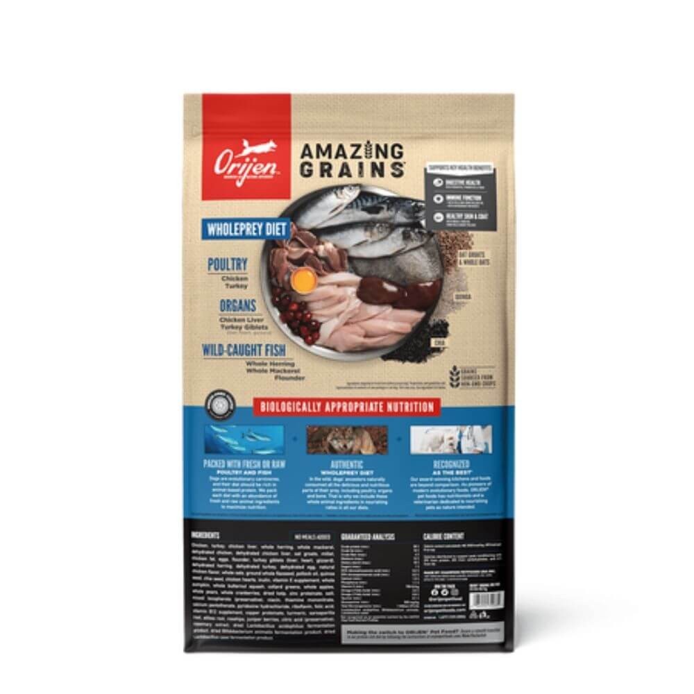 DESCRIPTION ORIJEN® Amazing Grains is packed with fresh or raw animal protein and enhanced with hand-selected grains to give your dog peak nourishment. With 90%* premium animal ingredients, ORIJEN Original with Amazing Grains includes WholePrey ingredients from free-run** chicken and turkey, and wild-caught fish. These nutrient-dense animal ingredients provide your dog with the protein, vitamins and minerals they need to thrive. We’ve also added only the most amazing grains in a high-quality blend of oats, quinoa and chia and more, hand-selected to provide a balanced fiber ratio that helps support your dog’s digestive health. Nourish your dog completely with the amazing animal protein and quality grains found in ORIJEN Amazing Grains. Nourish As Nature Intended® The first 5 ingredients are ALWAYS fresh or raw+ animal protein. 90%* quality poultry and fish ingredients, providing a strong source of essential protein, vitamins, and minerals to help support muscle maintenance. Our authentic WholePrey diet features the most succulent parts of the prey like poultry or fish, organs and bone to mimic what your dog’s ancestors consumed in the wild. Includes DHA and EPA from whole herring, mackerel and pollock oil to help support skin and coat health and immunity. Scientifically tested to support digestion with prebiotics, probiotics and soluble and insoluble fiber from inulin and our premium grain blend. Made in the USA with the world’s finest ingredients ORIJEN AMAZING GRAINS™ ORIGINAL DOG FOOD is formulated to meet the nutritional levels established by the AAFCO Dog Food Nutrient Profiles for All Life Stages, including growth of large size dogs (70 lb or more as an adult) Product Details Brand Orijen Species Dog Life Stage All Life Stages Breed Size All Breeds Protein Chicken, Turkey, Herring, Mackerel Special Diet High Protein, With Grain, No Corn, Wheat, or Soy, Pea-Free, Potato-Free Food Criteria Dry Food Packaging Bag Color Blue, Tan, Red ⚠️ IMPORTANT – PLEASE CONTACT ME FIRST If you experience any issue (tracking delays, missing or damaged items, incorrect order, etc.), please message me before opening a case. I respond very quickly (usually within 1–2 hours) and I’m always happy to help resolve any problem. Opening a case may slow down the resolution for both of us. Thank you for your understanding!