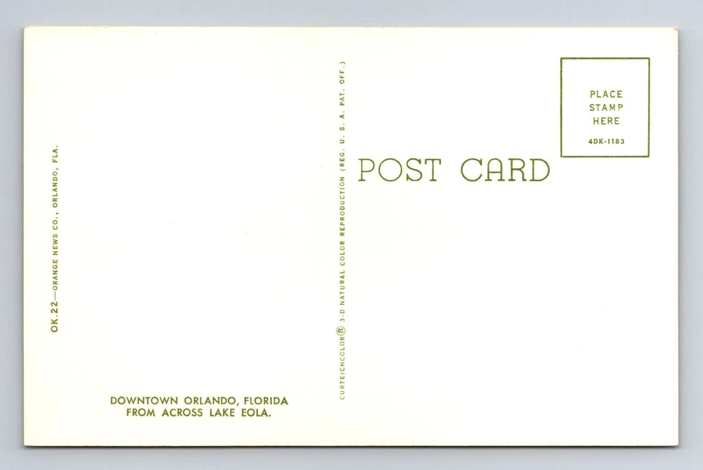 Country: USA Country/Region of Manufacture: Unknown Region: Florida City: Orlando Unit of Sale: Single Unit Era: Vintage Original/Licensed Reprint: Original Theme: Cities & Towns Subject: Cities & Towns Postage Condition: Unposted Type: Printed (Lithograph)